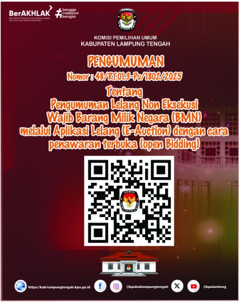 #temanpemilih Berikut disampaikan Pengumuman Nomor 48/RT.01.3-Pu/1802/2025 Tentang Pengumuman Lelang Non Eksekusi Wajib Barang Milik Negara (BMN) melalui Aplikasi Lelang (E-Auction). scan QRCODE untuk informasi lebih lanjut. Lihat dan Unduh Pengumuman #KPUMelayani #KPULamTeng ....
