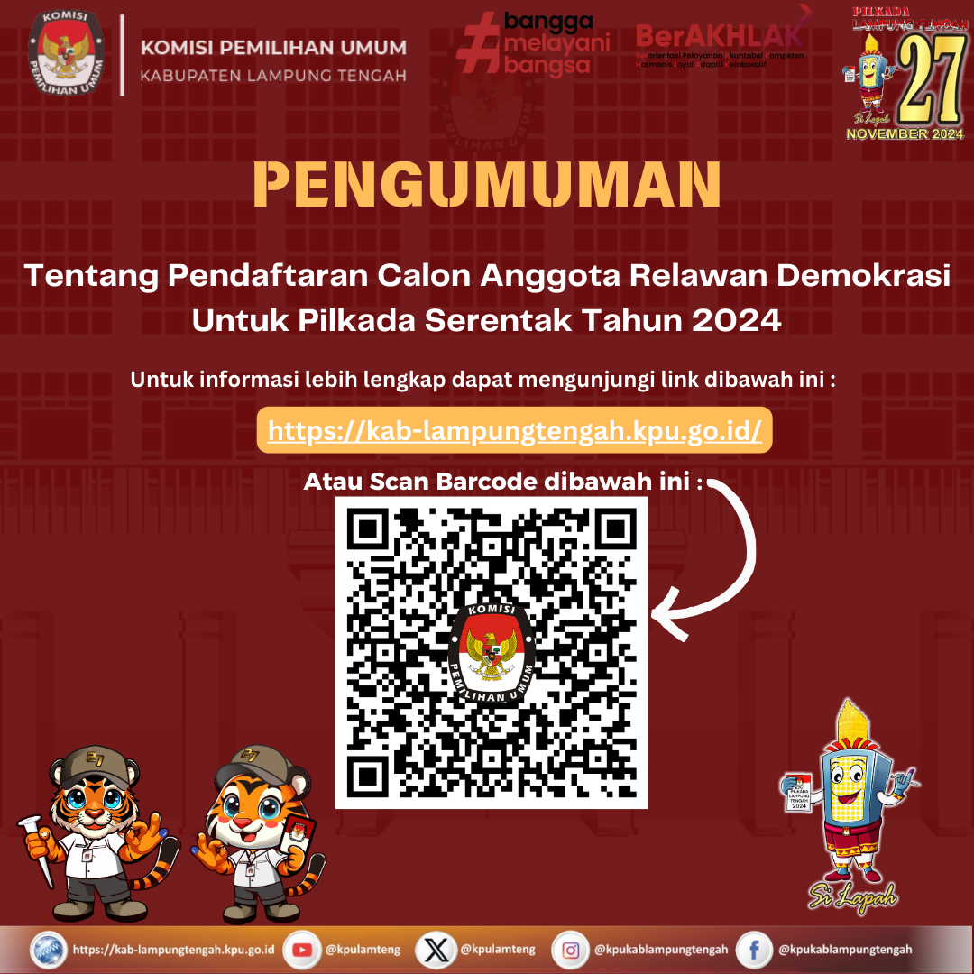 #TemanPemilih berikut disampaikan Pengumuman Nomor 644/PL.06.2-Pu/1802/2024 Tentang Pendaftaran Calon Anggota Relawan Demokrasi Untuk Pilkada Serentak Tahun 2024. Informasi selengkapnya dapat dilihat Disini atau Scan Barcode di info grafis. #KPUMelayani #KPULamTeng....