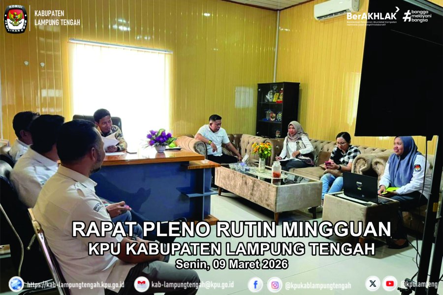 KPU Kabupaten Lampung Tengah kembali melaksanakan Rapat Pleno Rutin Mingguan pada Senin, 2 Maret 2026, bertempat di Ruang Rapat Pimpinan KPU Kabupaten Lampung Tengah. Rapat pleno ini merupakan agenda rutin kelembagaan yang dilaksanakan secara berkesinambungan sebagai sarana koordinasi internal, evaluasi kinerja, serta penyelarasan program dan kegiatan di lingkungan KPU Kabupaten Lampung Tengah. Rapat Pleno dipimpin langsung oleh Ketua KPU Kabupaten Lampung Tengah, Gunarto, dan dihadiri oleh seluruh Anggota KPU Kabupaten Lampung Tengah serta jajaran Sekretariat KPU Kabupaten Lampung Tengah. Kehadiran unsur pimpinan dan sekretariat secara lengkap mencerminkan komitmen bersama dalam membangun komunikasi yang efektif, meningkatkan sinergi kerja, serta menjaga soliditas kelembagaan dalam menjalankan tugas sebagai penyelenggara pemilu. Agenda utama yang dibahas dalam Rapat Pleno Rutin Mingguan ini adalah internalisasi kebijakan serta sinkronisasi kegiatan teknis kepemiluan Tahun 2026 pada satuan kerja KPU Kabupaten Lampung Tengah. Pembahasan ini bertujuan untuk memastikan bahwa seluruh kebijakan, regulasi, dan arahan yang berasal dari KPU RI maupun KPU Provinsi dapat dipahami secara utuh dan diimplementasikan secara konsisten oleh seluruh divisi dan bagian sekretariat. Dengan adanya internalisasi kebijakan, diharapkan tidak terdapat perbedaan pemahaman dalam pelaksanaan tugas dan tanggung jawab di masing-masing unit kerja. Selain itu, rapat pleno juga membahas sinkronisasi perencanaan dan pelaksanaan kegiatan teknis kepemiluan agar seluruh program kerja Tahun 2026 dapat berjalan secara terstruktur, terukur, dan saling mendukung. Masing-masing divisi menyampaikan laporan perkembangan kegiatan yang telah dilaksanakan, capaian yang diraih, serta rencana kegiatan yang akan dilaksanakan dalam waktu dekat. Evaluasi terhadap kegiatan sebelumnya juga dilakukan sebagai bahan perbaikan dan peningkatan kualitas pelaksanaan program ke depan. Dalam forum pleno tersebut, turut dibahas berbagai tantangan dan kendala yang dihadapi dalam pelaksanaan tugas, baik yang bersifat administratif, teknis, maupun koordinatif. Selanjutnya, rapat merumuskan langkah-langkah strategis dan solusi yang dapat ditempuh secara bersama-sama guna meminimalkan hambatan serta memastikan seluruh kegiatan berjalan sesuai dengan jadwal dan ketentuan yang berlaku. Melalui pelaksanaan Rapat Pleno Rutin Mingguan ini, KPU Kabupaten Lampung Tengah menegaskan komitmennya untuk terus memperkuat tata kelola organisasi yang profesional, transparan, dan akuntabel. Rapat pleno diharapkan dapat menjadi media pengambilan keputusan yang efektif, memperkuat koordinasi lintas divisi, serta meningkatkan kinerja kelembagaan dalam rangka menyukseskan seluruh tahapan dan kegiatan kepemiluan Tahun 2026 secara optimal, berintegritas, dan berlandaskan peraturan perundang-undangan yang berlaku. ....