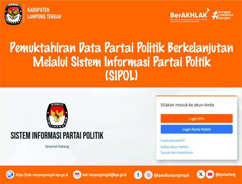 Komisi Pemilihan Umum Kabupaten Lampung Tengah mengumumkan kepada seluruh Partai Politik di wilayah Kabupaten Lampung Tengah bahwa telah dilaksanakan Pemutakhiran Data dan Dokumen Partai Politik secara Berkelanjutan melalui Sistem Informasi Partai Politik (SIPOL) Semester II Tahun 2025.