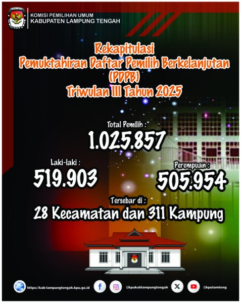 Berikut ini Infografis Pemutakhiran Daftar Pemilih Berkelanjutan Triwulan III ahun 2025 Tingkat Kabupaten Lampung Tengah yang tersebar di , 311 (tiga ratus sebelas) Kampung/Kelurahan dan 28 (dua puluh delapan) Kecamatan se-Kabupaten Lampung Tengah.