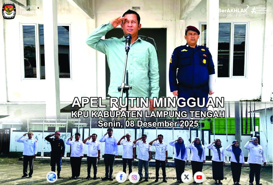 Komisi Pemilihan Umum (KPU) Kabupaten Lampung Tengah melaksanakan apel rutin mingguan pada Senin, 8 Desember 2025, yang bertempat di halaman Kantor KPU Kabupaten Lampung Tengah. Apel diikuti oleh seluruh jajaran komisioner, pejabat struktural, serta seluruh staf sekretariat dalam rangka memperkuat kedisiplinan, meningkatkan soliditas, dan menjaga semangat kerja aparatur.