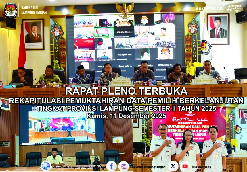 Komisi Pemilihan Umum (KPU) Kabupaten Lampung Tengah menghadiri Rapat Pleno Terbuka Rekapitulasi Pemutakhiran Data Pemilih Berkelanjutan (PDPB) Semester II Tahun 2025 yang diselenggarakan oleh KPU Provinsi Lampung. Kegiatan pleno ini merupakan agenda rutin yang memiliki peran strategis dalam memastikan kualitas dan akurasi data pemilih secara berkelanjutan di wilayah Provinsi Lampung, pada Kamis, 11 Desember 2025.