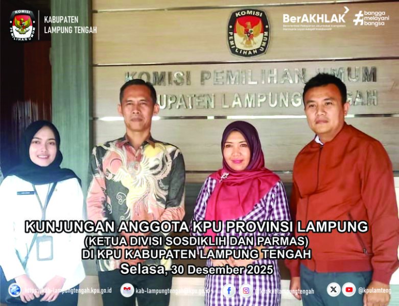 Komisi Pemilihan Umum (KPU) Kabupaten Lampung Tengah menerima kunjungan kerja Anggota KPU Provinsi Lampung, Ketua Divisi Sosialisasi, Pendidikan Pemilih, dan Partisipasi Masyarakat (Sosdiklih dan Parmas), Dedi Fernando, beserta jajaran Sekretariat KPU Provinsi Lampung, pada Selasa, 30 Desember 2025, bertempat di Kantor KPU Kabupaten Lampung Tengah.