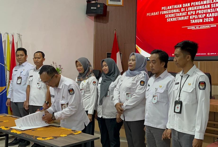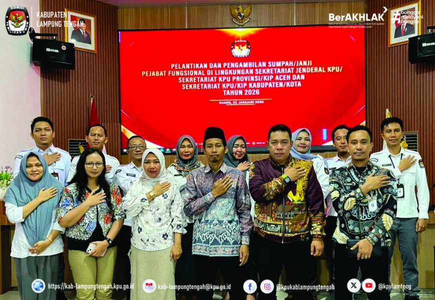 Dalam rangka memperkuat struktur organisasi serta meningkatkan kualitas sumber daya manusia yang profesional dan berintegritas, Komisi Pemilihan Umum (KPU) Kabupaten Lampung Tengah melaksanakan kegiatan Pelantikan dan Pengambilan Sumpah/Janji Pejabat Fungsional pada Kamis, 22 Januari 2026. Kegiatan ini dilaksanakan secara daring dan serentak di seluruh Indonesia, sebagai bagian dari kebijakan nasional KPU RI dalam penataan dan pengembangan jabatan fungsional di lingkungan Komisi Pemilihan Umum.