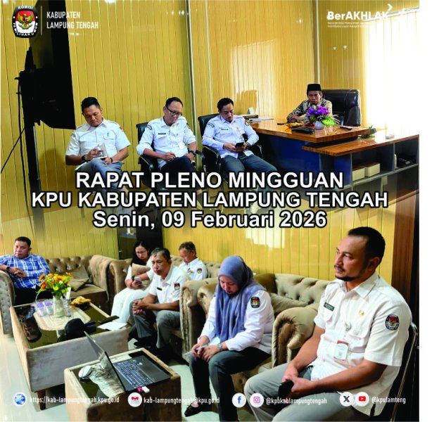 KPU Kabupaten Lampung Tengah menyelenggarakan Rapat Pleno Mingguan pada Senin, 9 Februari 2026. Kegiatan ini dilaksanakan di Ruang Rapat Pimpinan KPU Kabupaten Lampung Tengah sebagai bagian dari agenda rutin kelembagaan dalam rangka menjaga kesinambungan koordinasi, evaluasi, serta konsolidasi internal antara unsur pimpinan, anggota, dan jajaran sekretariat.
