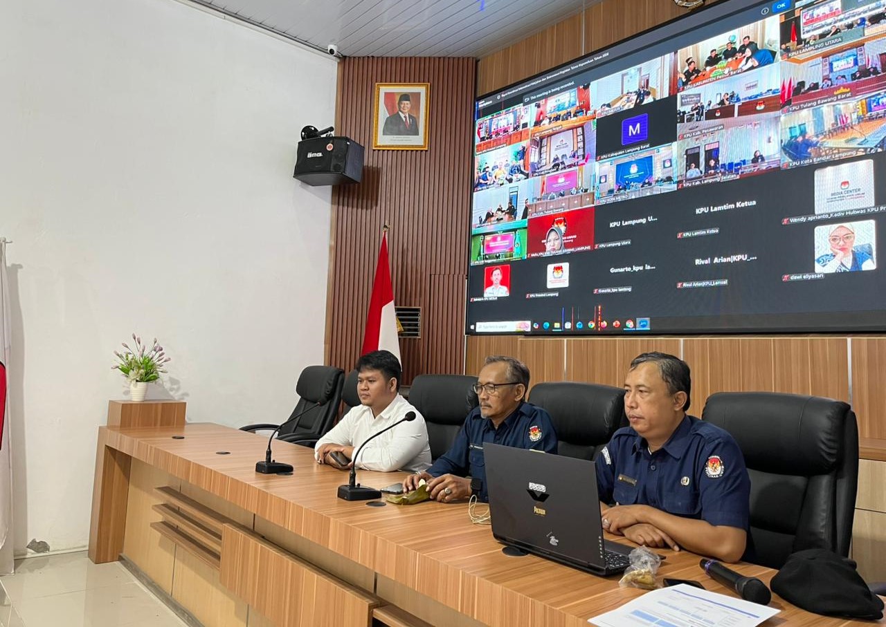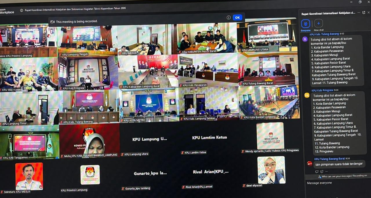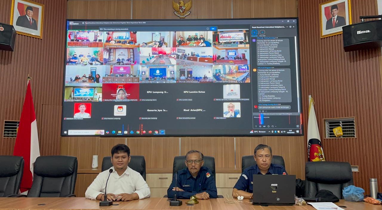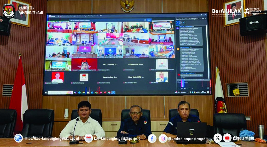 KPU Kabupaten Lampung Tengah mengikuti Rapat Koordinasi Internalisasi Kebijakan dan Sinkronisasi Kegiatan Teknis Kepemiluan Tahun 2026 yang diselenggarakan oleh KPU Provinsi Lampung secara daring pada Selasa, 10 Februari 2026. Kegiatan ini dilaksanakan sebagai bagian dari langkah strategis untuk memperkuat konsolidasi kelembagaan serta memastikan keselarasan kebijakan dan pelaksanaan program kepemiluan di seluruh wilayah Provinsi Lampung.