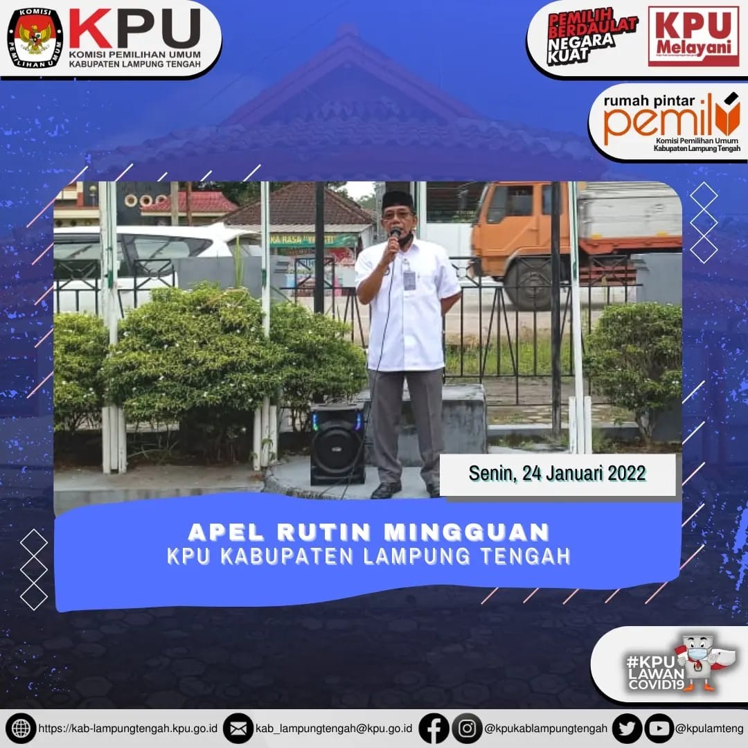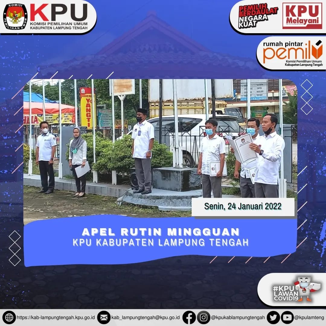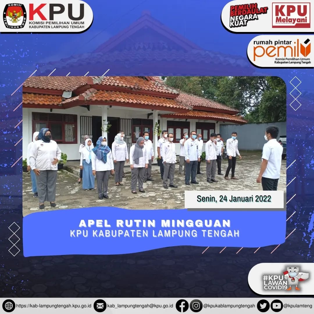 KPU Kabupaten Lampung Tengah pada hari ini Senin, 24 Januari 2022 Pukul 08.00 WIB melaksanakan Apel Rutin Mingguan di Halaman Kantor KPU Kabupaten Lampung Tengah.