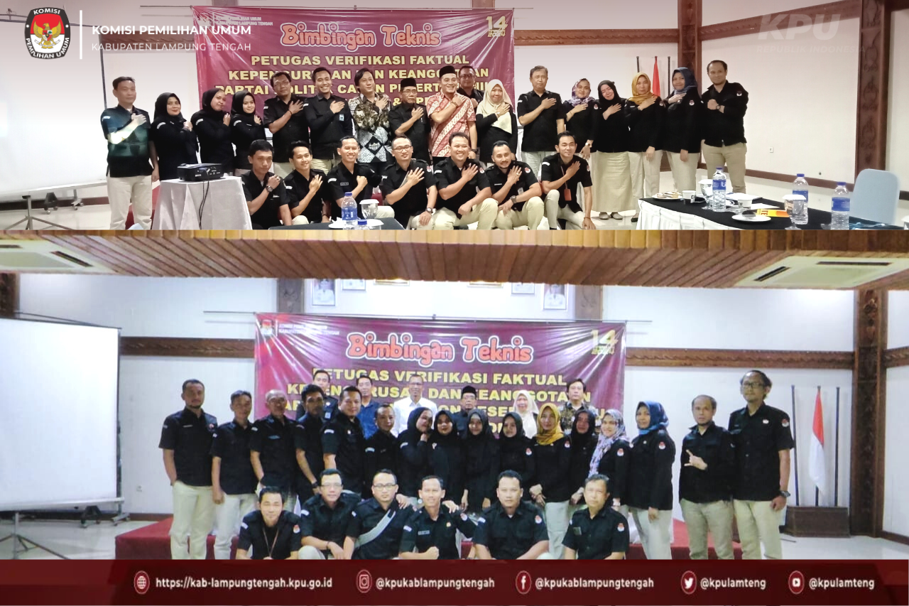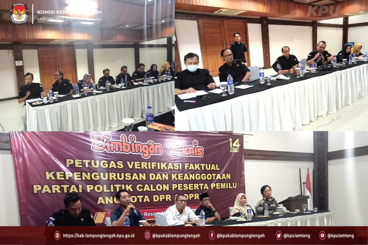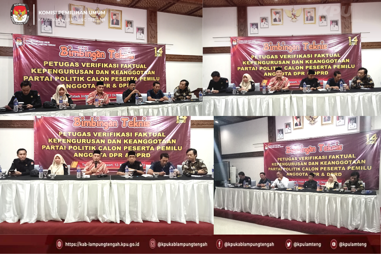 Menjelang akan dilaksanakan Verifikasi Faktual terhadap partai politik, Komisi Pemilihan Umum Kabupaten Lampung Tengah melaksanakan kegiatan Bimbingan Teknis Petugas Verifikator Pada Pelaksanaan Verifikasi Faktual Kepengurusan dan Keanggotaan Partai Politik Calon Peserta Pemilu Tahun 2024. Kegiatan Bimbingan Teknis ini dilaksanakan selama dua hari pada tanggal 12 sampai dengan 13 Oktober 2022 bertempat di Tabek Indah Resort.