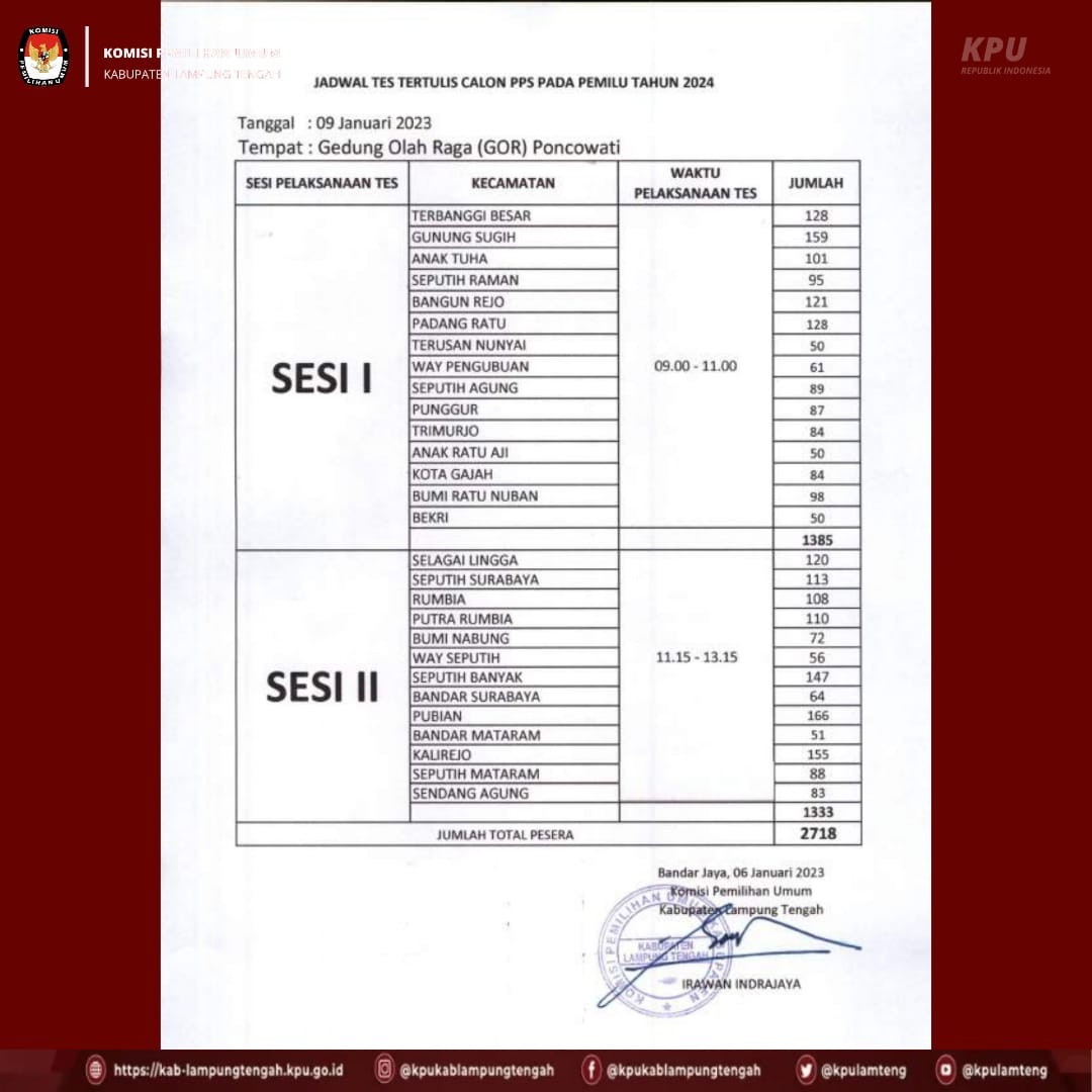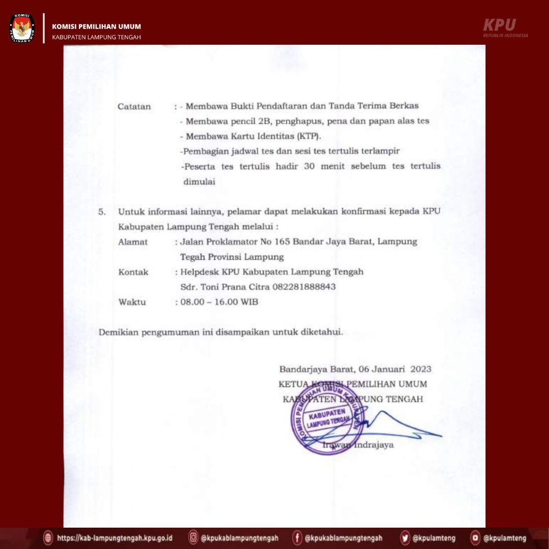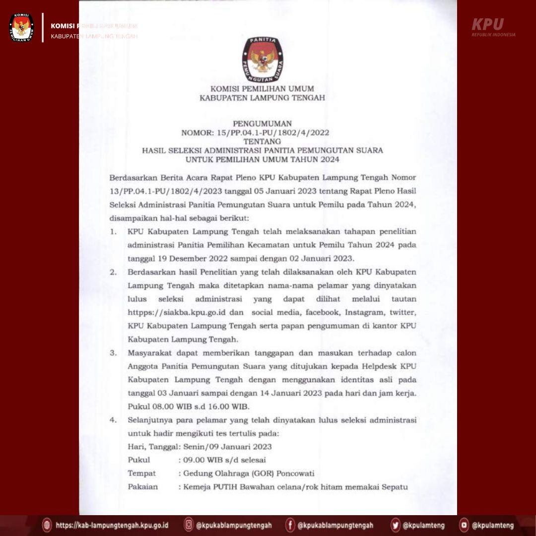 Berikut ini disampaikan Pengumuman Komisi Pemilihan Umum Kabupaten Lampung Tengah Nomor: 15/PP.04.1-PU/1802/4/2022 Tentang Hasil Penelitian Administrasi Calon Anggota Panitia Pemungutan Suara (PPS) Untuk Pemilihan Umum Tahun 2024.