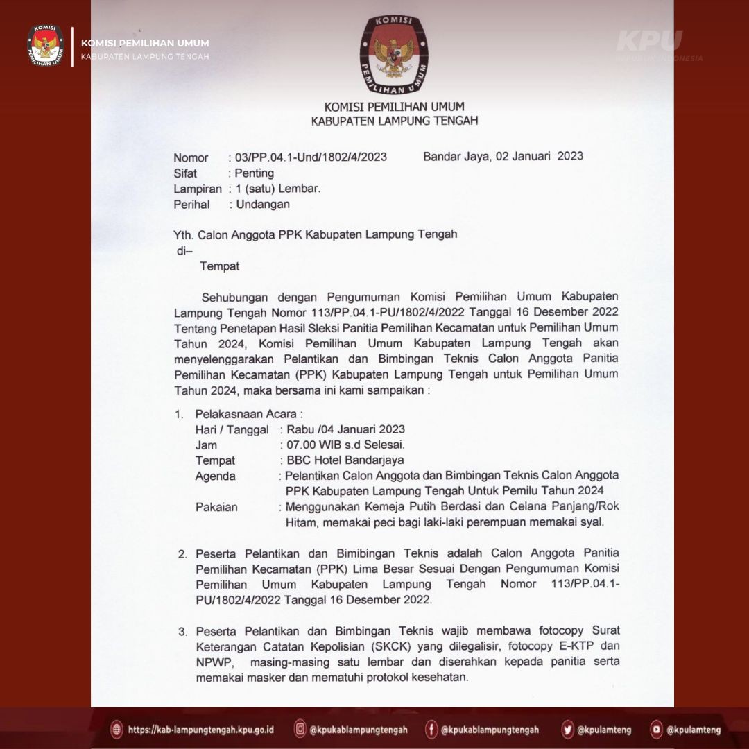 Jadwal Pelaksanaan Pelantikan dan Bimbingan Teknis Calon Anggota PPK Selasa, 03 Januari 2023 00:00 260 Hai #TemanPemilih Berikut Jadwal Pelaksanaan Pelantikan dan Bimbingan Teknis Calon Anggota Panitia Pemilihan Kecamatan (PPK) untuk Pemilu Tahun 2024. #KPUMelayani #KPULamTeng #Pemiluserentak2024 Bagikan: Telah dilihat 260 kali