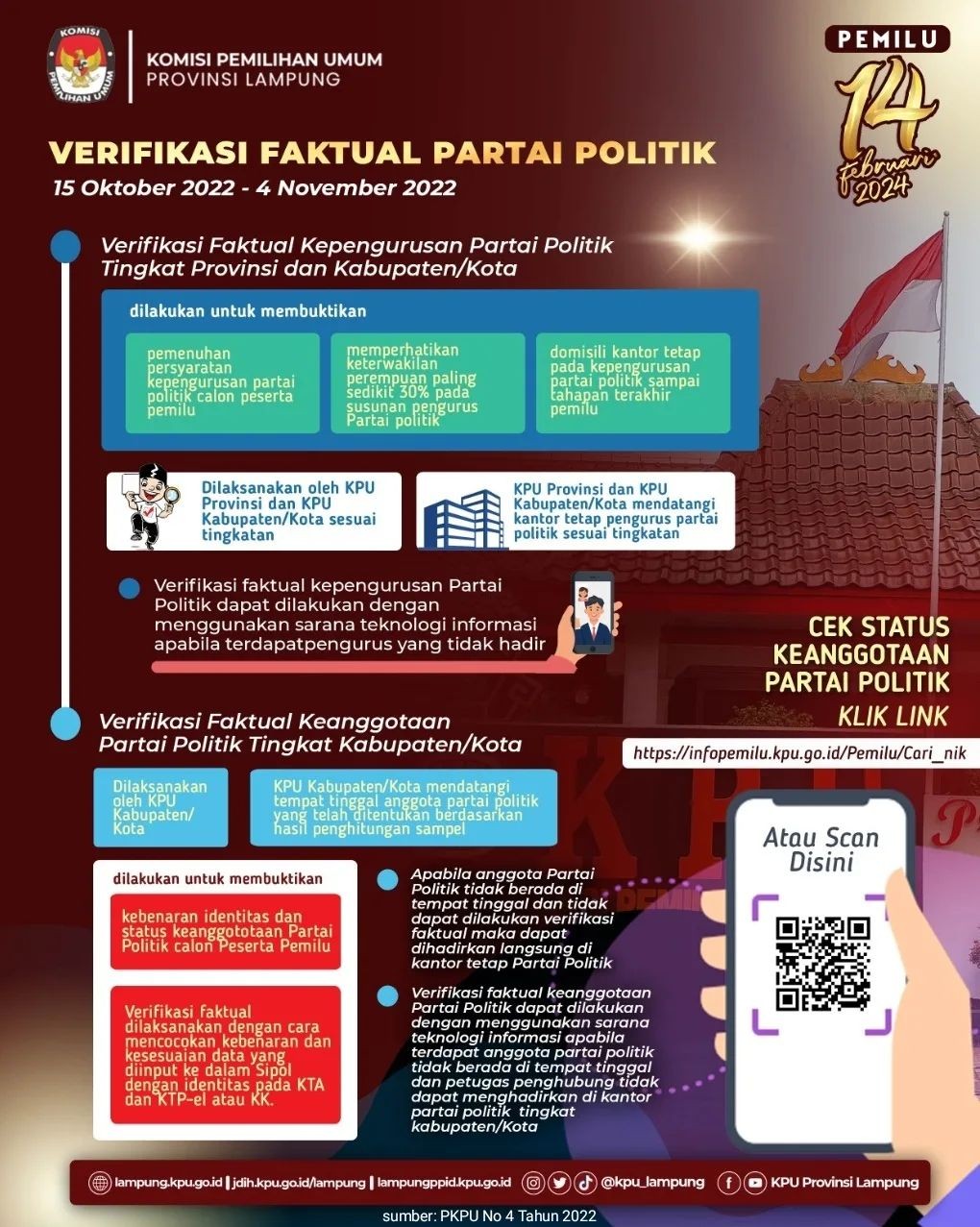 Verifikasi faktual kepengurusan ini juga akan dilaksanakan di KPU Kabupaten/Kota sekaligus juga melakukan verifikasi faktual keanggotaan partai politik dari tanggal 15 Oktober - 4 November 2022. Selengkapnya simak di infografis berikut: