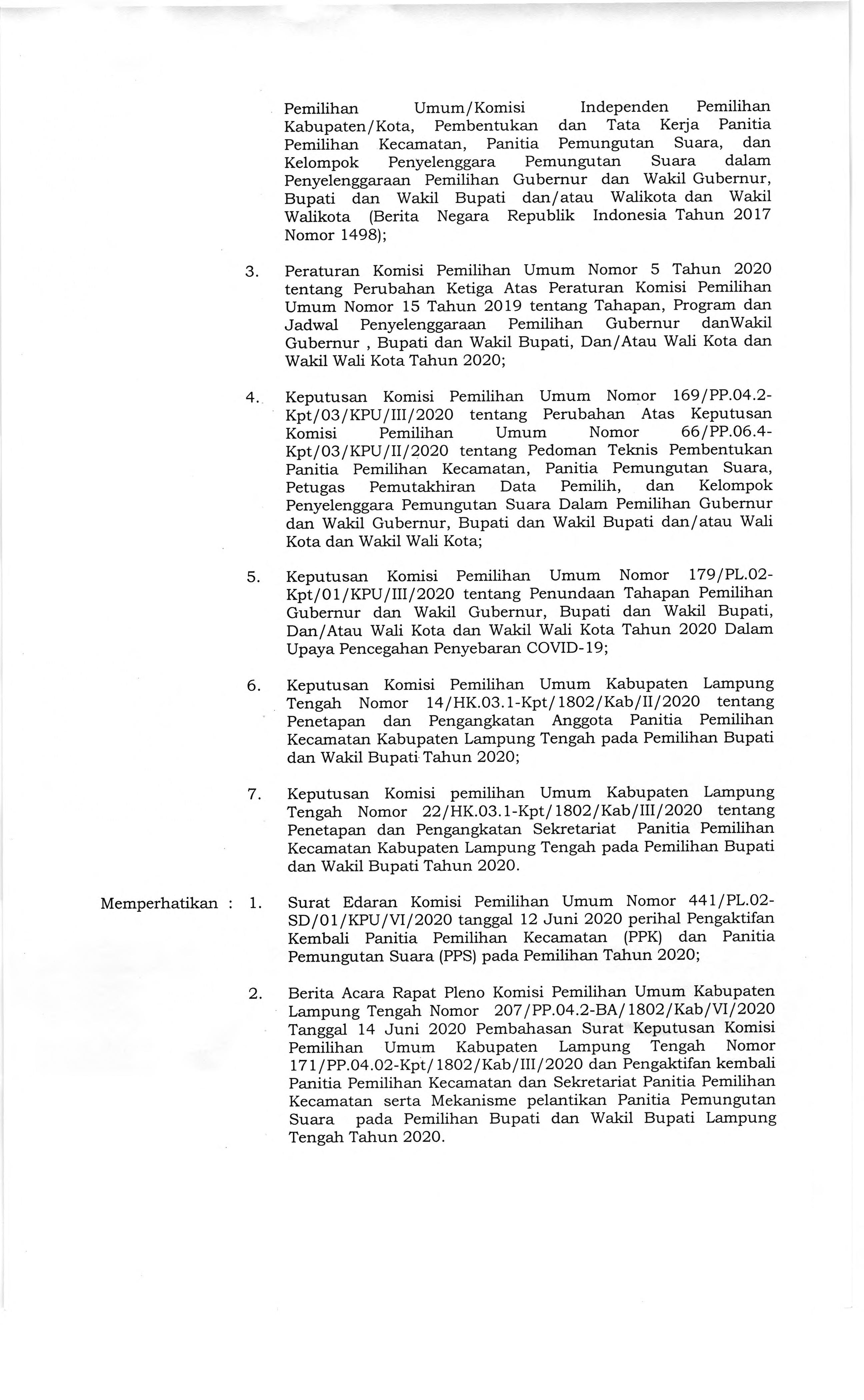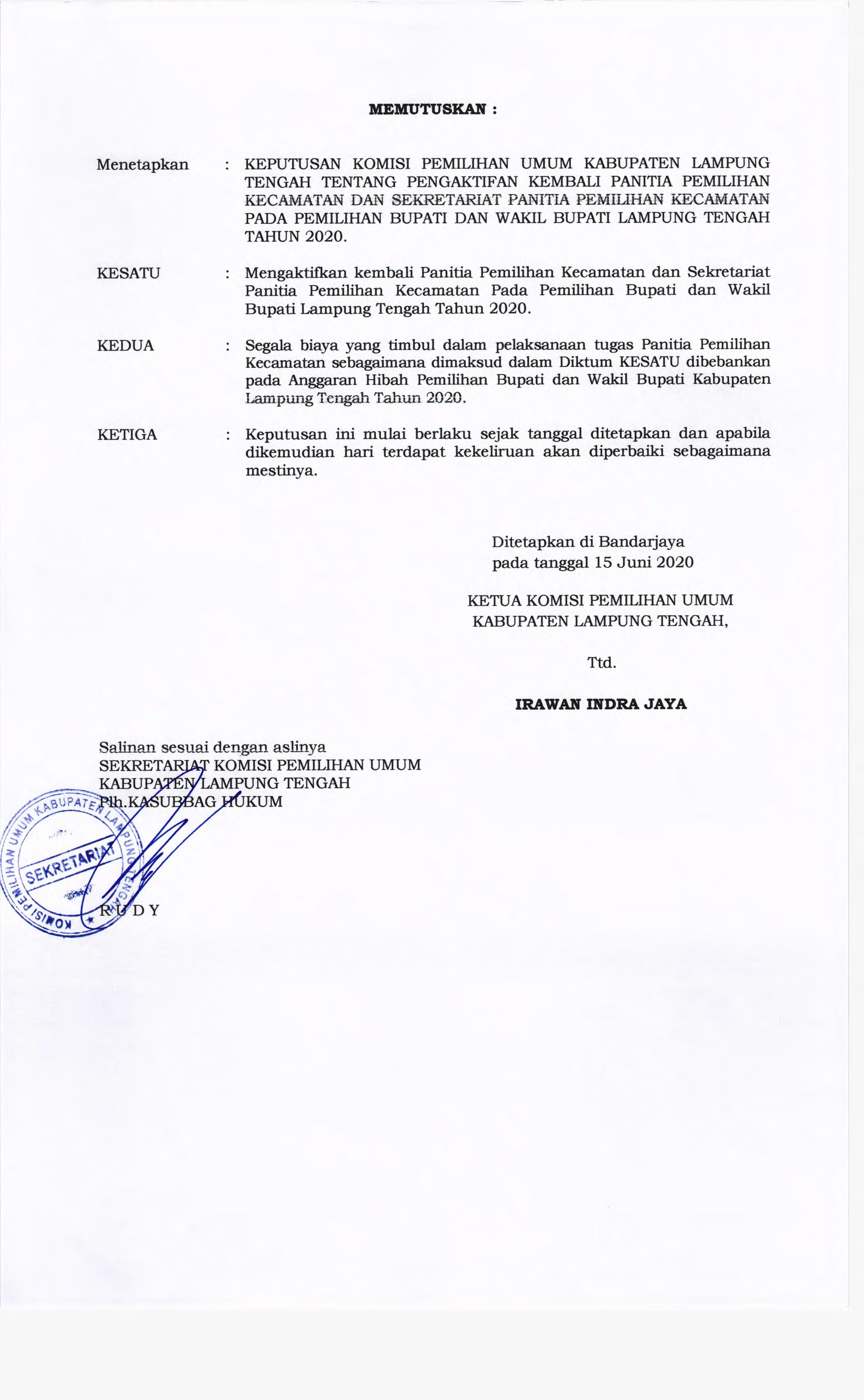Keputusan KPU Lampung Tengah tentang Pengaktifan Kembali Panitia Pemilihan Kecamatan (PPK) dan Sekretariat PPK Pada Pemilihan Bupati dan Wakil Bupati Lampung Tengah Tahun 2020