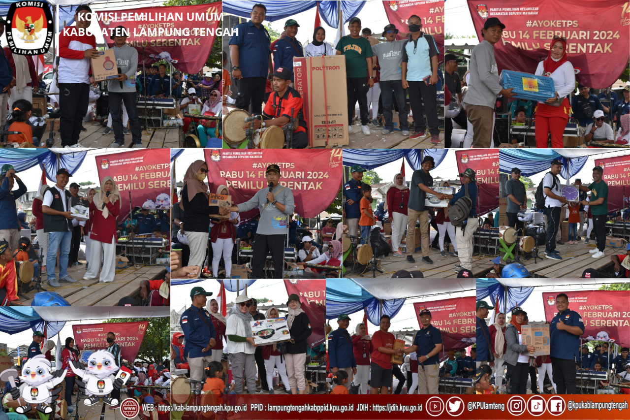 Dalam memeriahkan kirab pemilu Tahun 2024, KPU telah menyiapkan hiburan rakyat dan doorprize/hadiah yang menarik untuk peserta jalan sehat yang kuponnya dibagikan pada saat jalan sehat dilakukan. Disela-sela hiburan rakyat tim rombongan pawai kirab pemilu tahun 2024 juga melaksanakan Grebek Pasar di Pasar Merapi Kecamatan Seputih Mataram. Grebek Pasar ini dilakukan untuk memberikan informasi tentang pelaksanaan Pemilu Tahun 2024.Setelah seluruh rangkain kegiatan telah diselesaikan, rombongan Kirab Pemilu 2024 kembali ke kantor KPU Kabupaten Lampung Tengah.