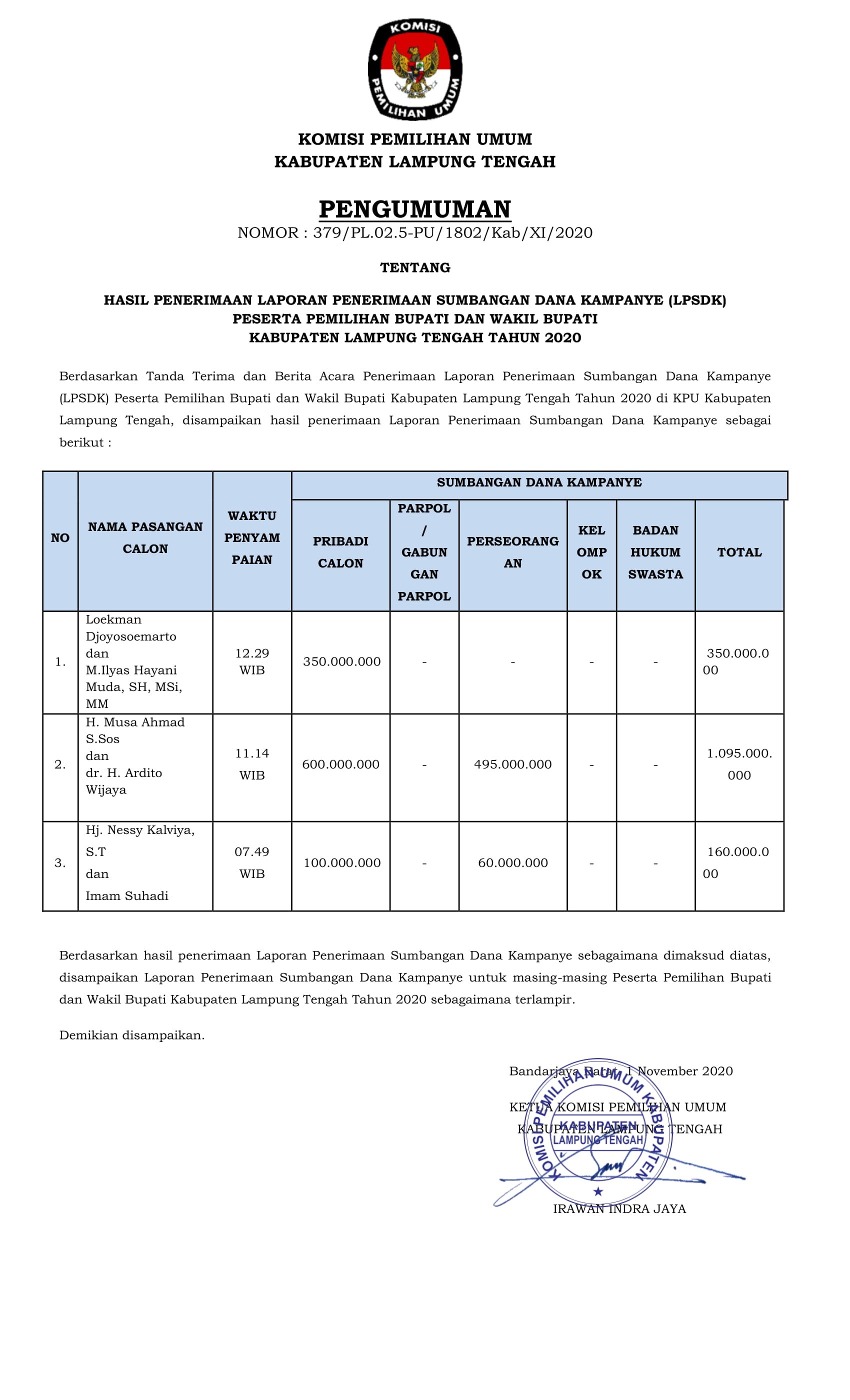 Berikut ini kami sampaikan Pengumuman Hasil Penerimaan Laporan Penerimaan Sumbangan Dana Kampanye (LPSDK) Peserta Pemilihan Bupati dan Wakil Bupati Lampung Tengah Tahun 2020.