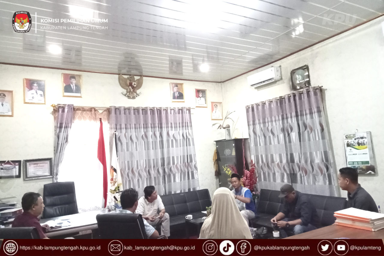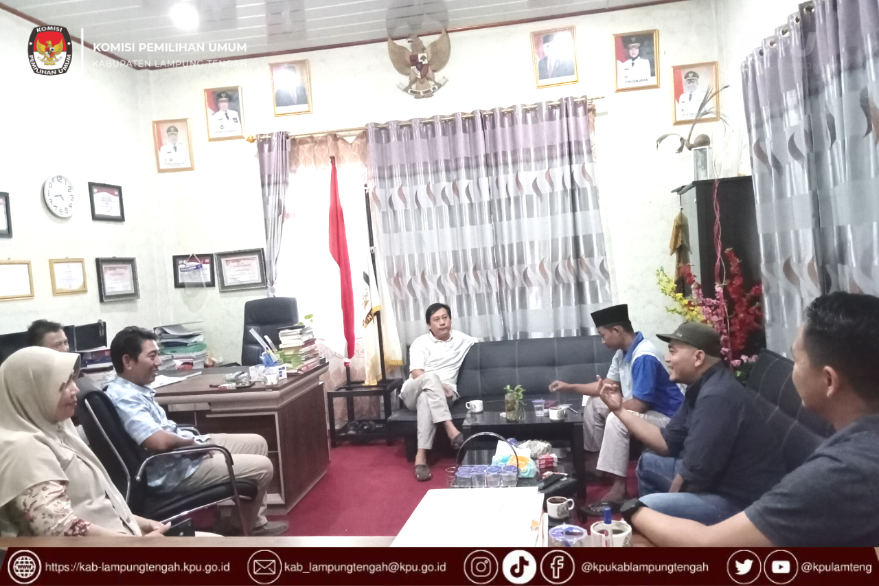 Komisi Pemilihan Umum Kabupaten Lampung Tengah pada hari Minggu, 04 September menerima kunjungan kerja Kadiv Teknis Provinsi Lampung terkait Monitoring Verifikasi Administrasi Partai Politik Terkait Klarifikasi Kegandaan Keanggotaan Partai Pemilu Tahun 2024.