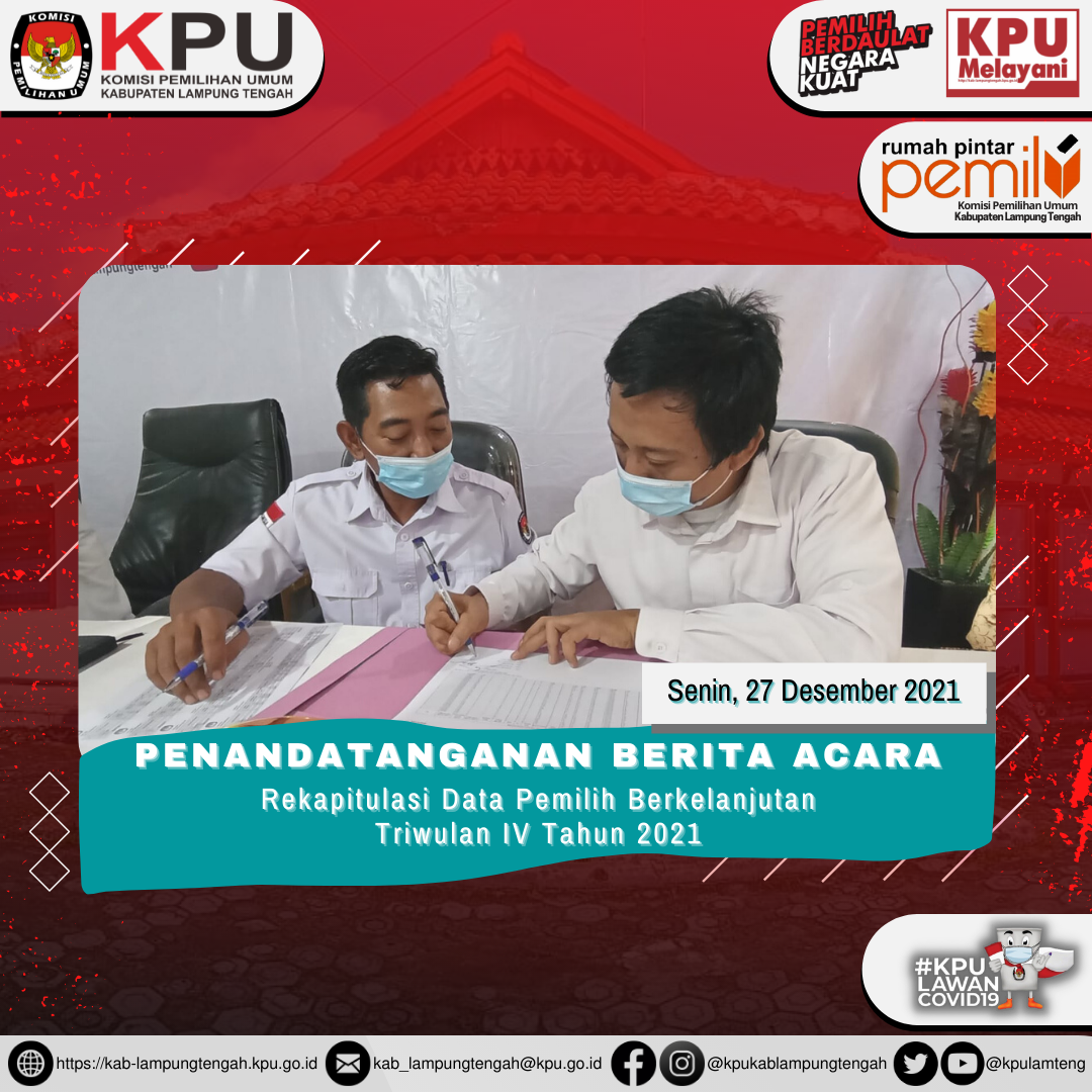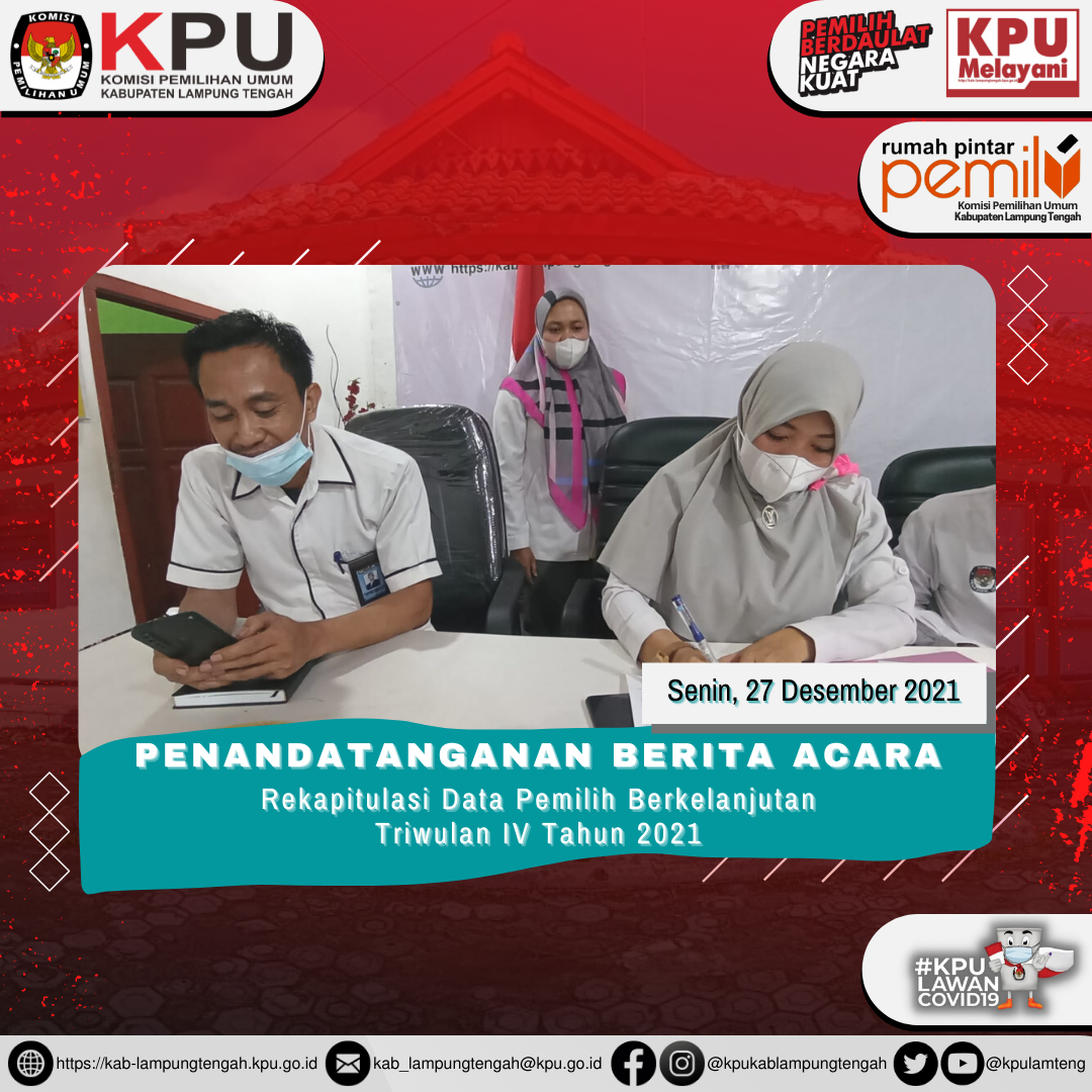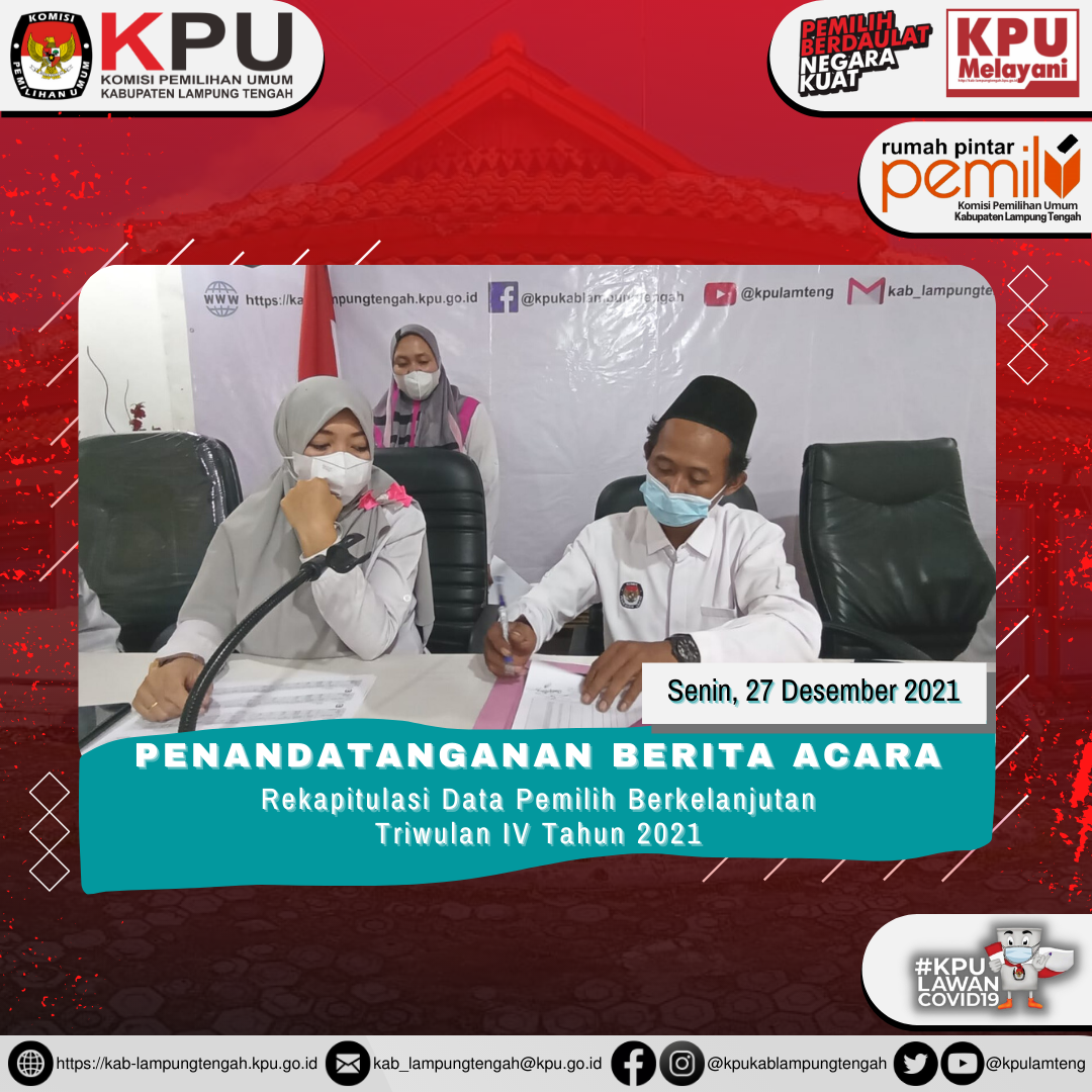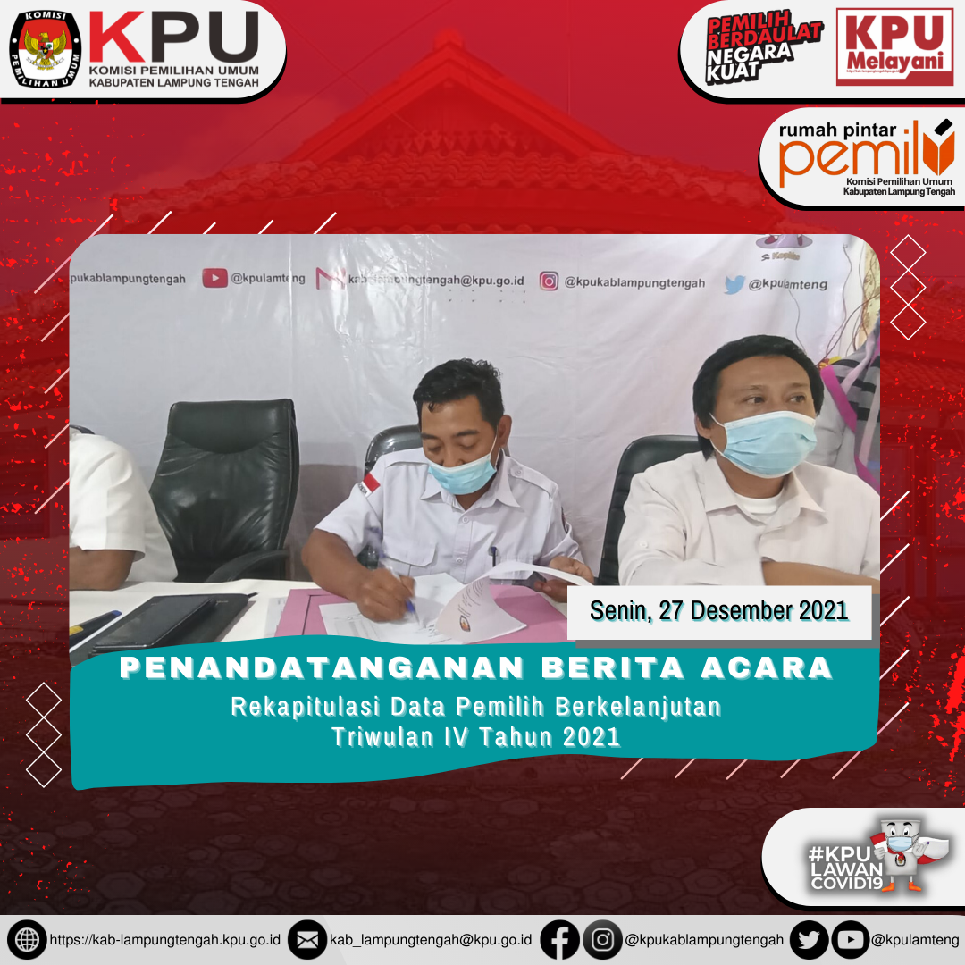Penandatanganan Berita Acara Rapat Koordinasi Data Pemilih Berkelanjutan untuk periode Triwulan IV tahun 2021 oleh Ketua dan Anggota KPU Kabupaten Lampung Tengah.