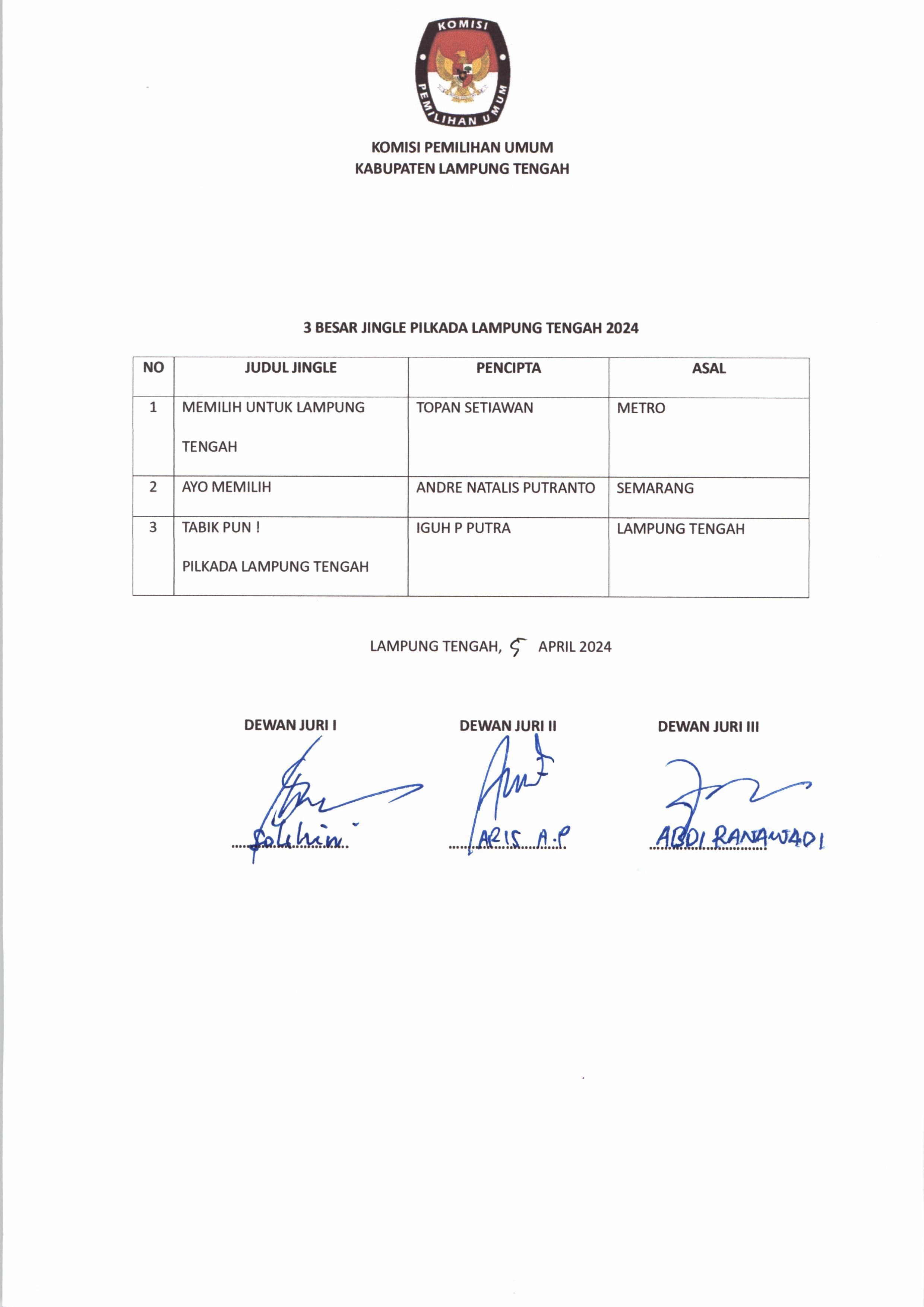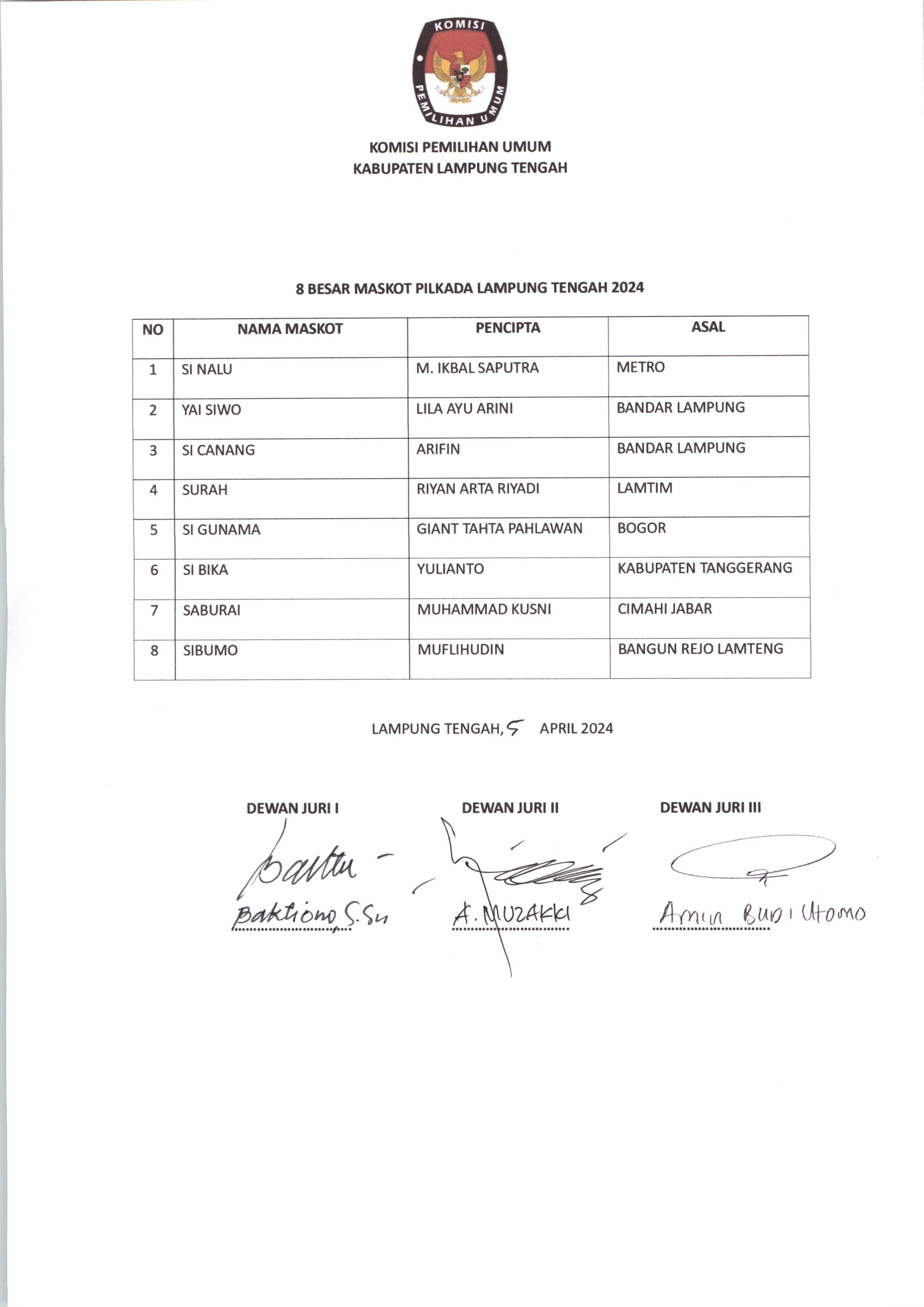 Pengumuman 8 (delapan) besar Lomba Cipta Maskot dan 3 (tiga) besar Lomba cipta Jingle Pilkada 2024 serentak untuk Pemilihan Bupati dan Wakil Bupati Kabupaten Lampung Tengah