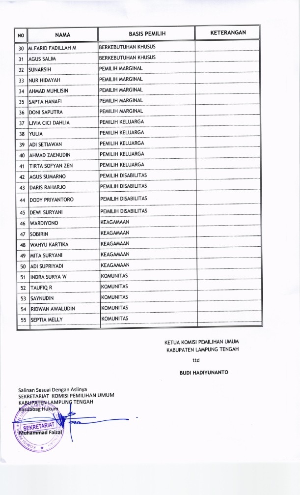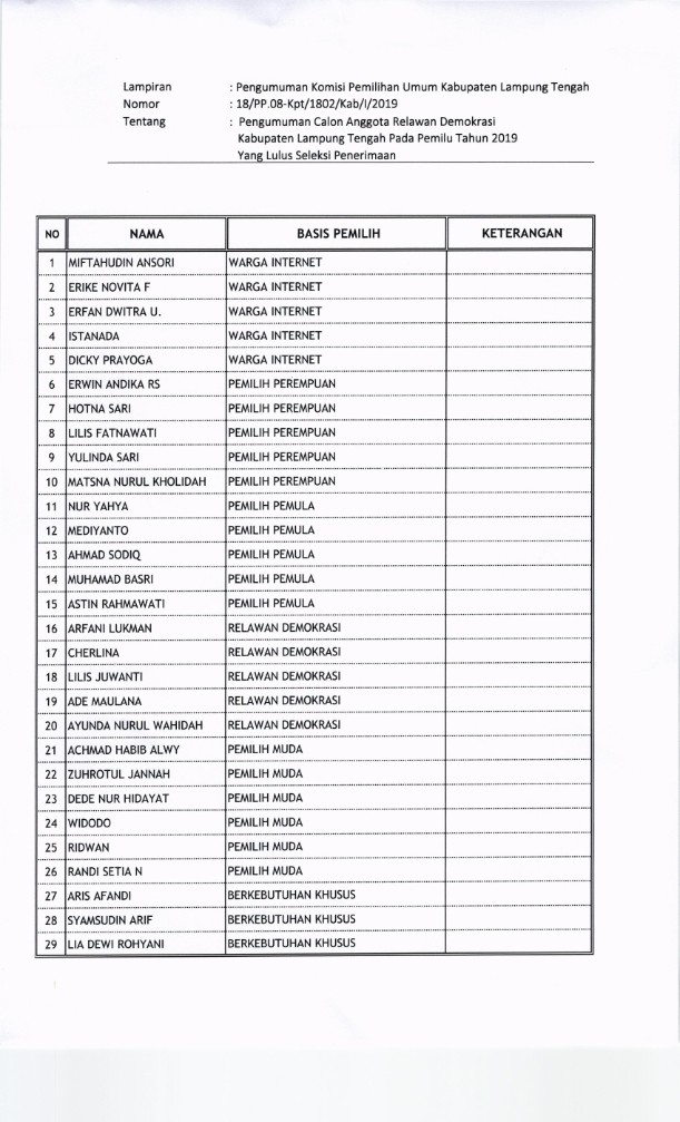 Berdasarkan Surat Keputusan Komisi Pemilihan Umum Kabupaten Lampung Tengah tentang Calon Anggota Rewalan Demokrasi Kabupaten Lampung Tengah Pada Pemilu tahun 2019 Nomor : 18/PP.08-PU/1802/Kab/I/2019 Tanggal : 17 Januari 2019, mengumumkan nama-nama calon Anggota Relawan Demokrasi yang LULUS Seleksi adalah sebagai berikut :