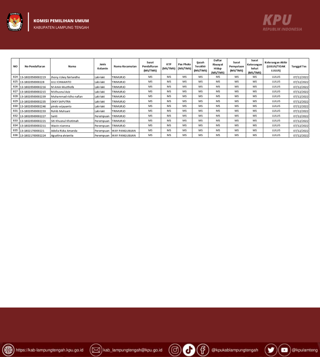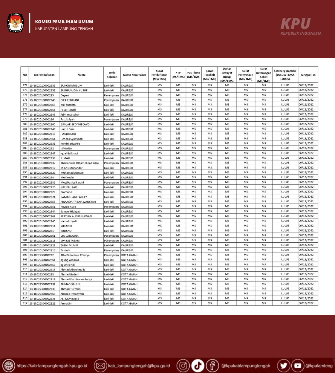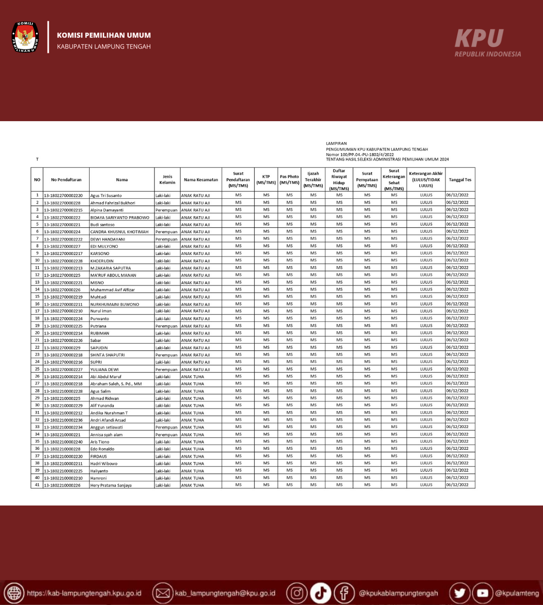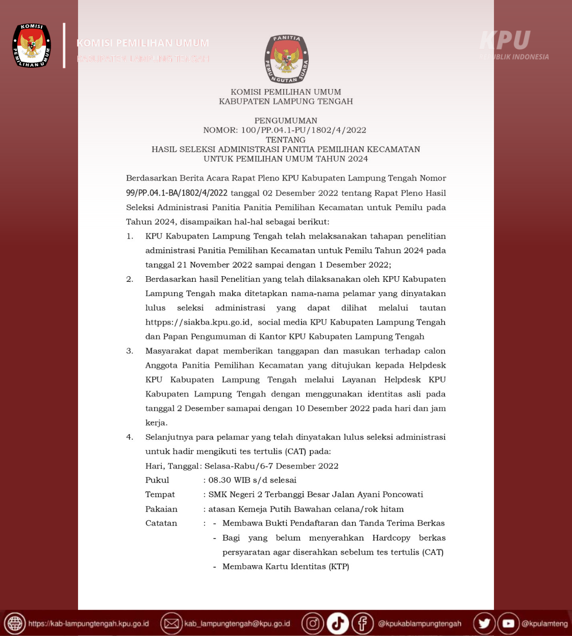 #temanpemilih, Setelah melalui pendaftaran secara online melalui SIAKBA dan verifikasi administrasi Calon Anggota PPK untuk Pemilu Tahun 2024. Maka KPU Kabupaten Lampung Tengah Mengumumkan Hasil Seleksi Administrasi Bagi Calon Anggota PPK dengan Hasil terlampir.
