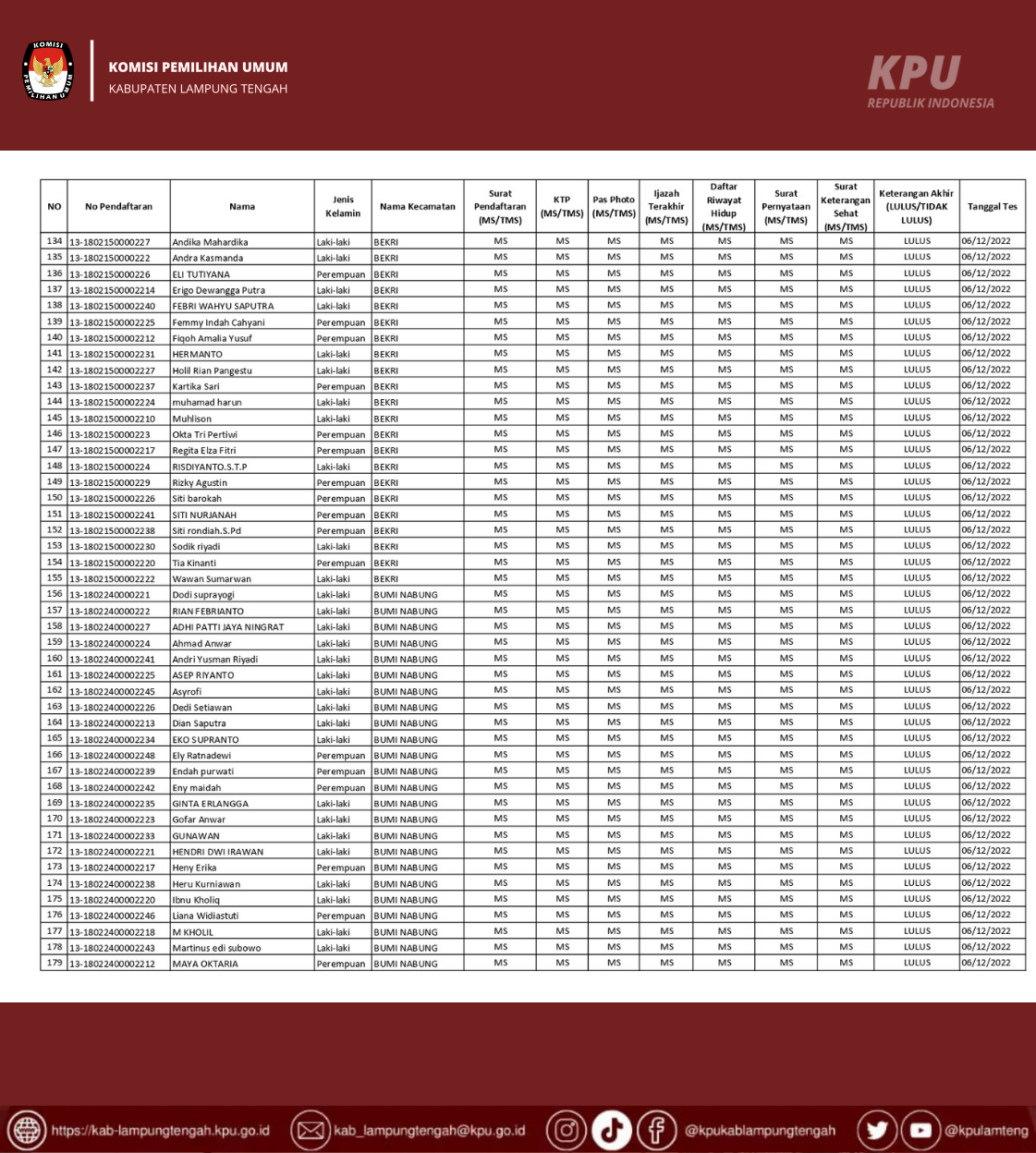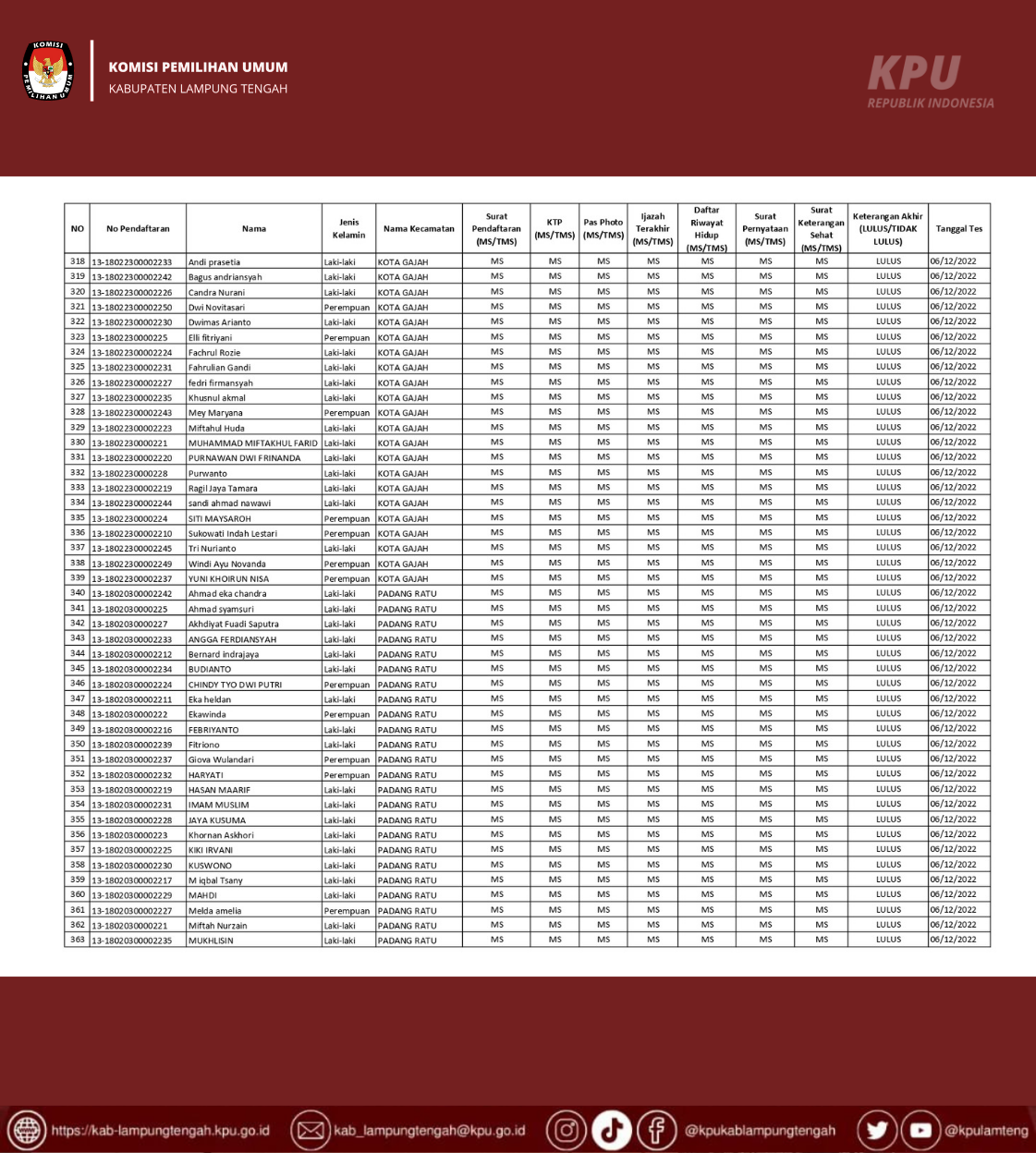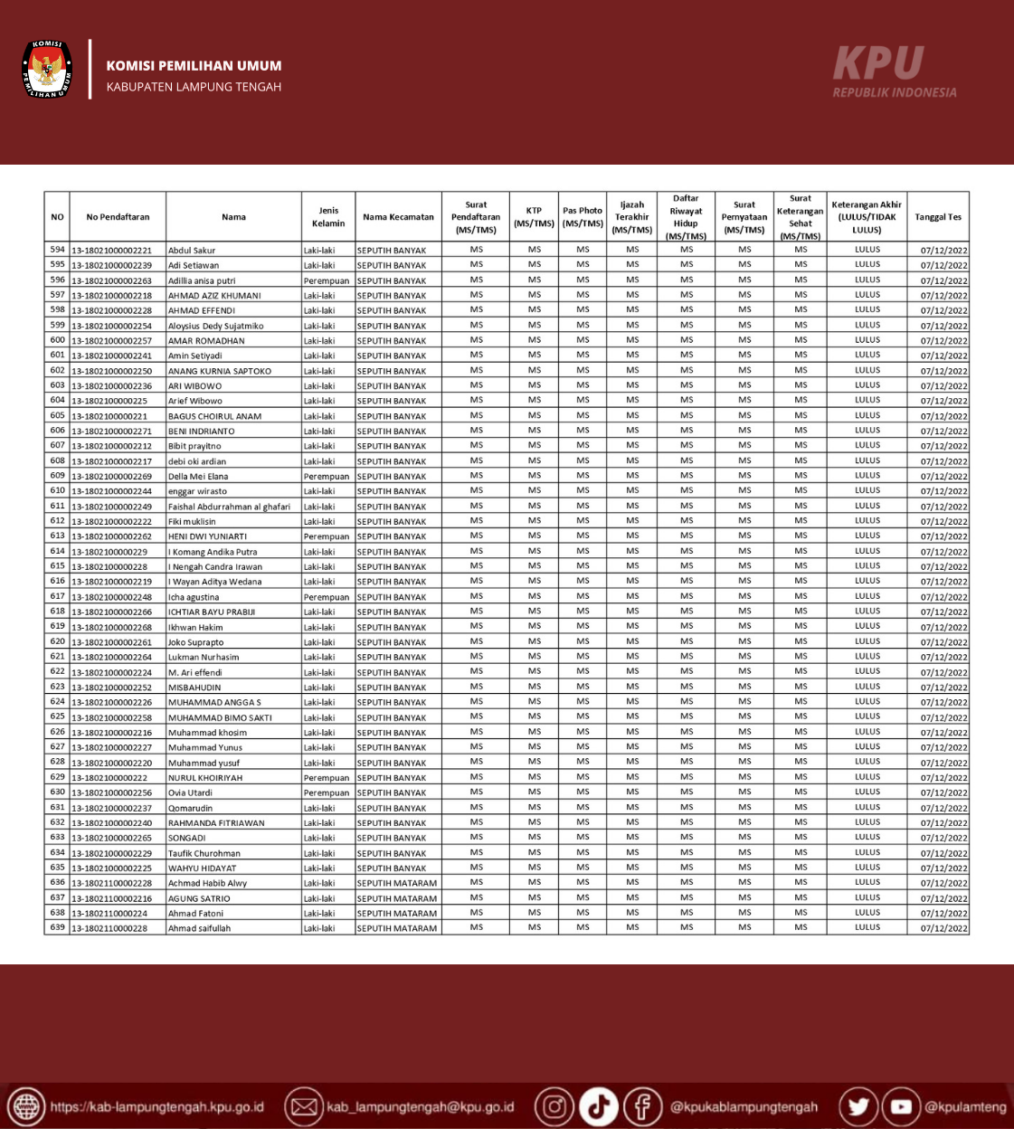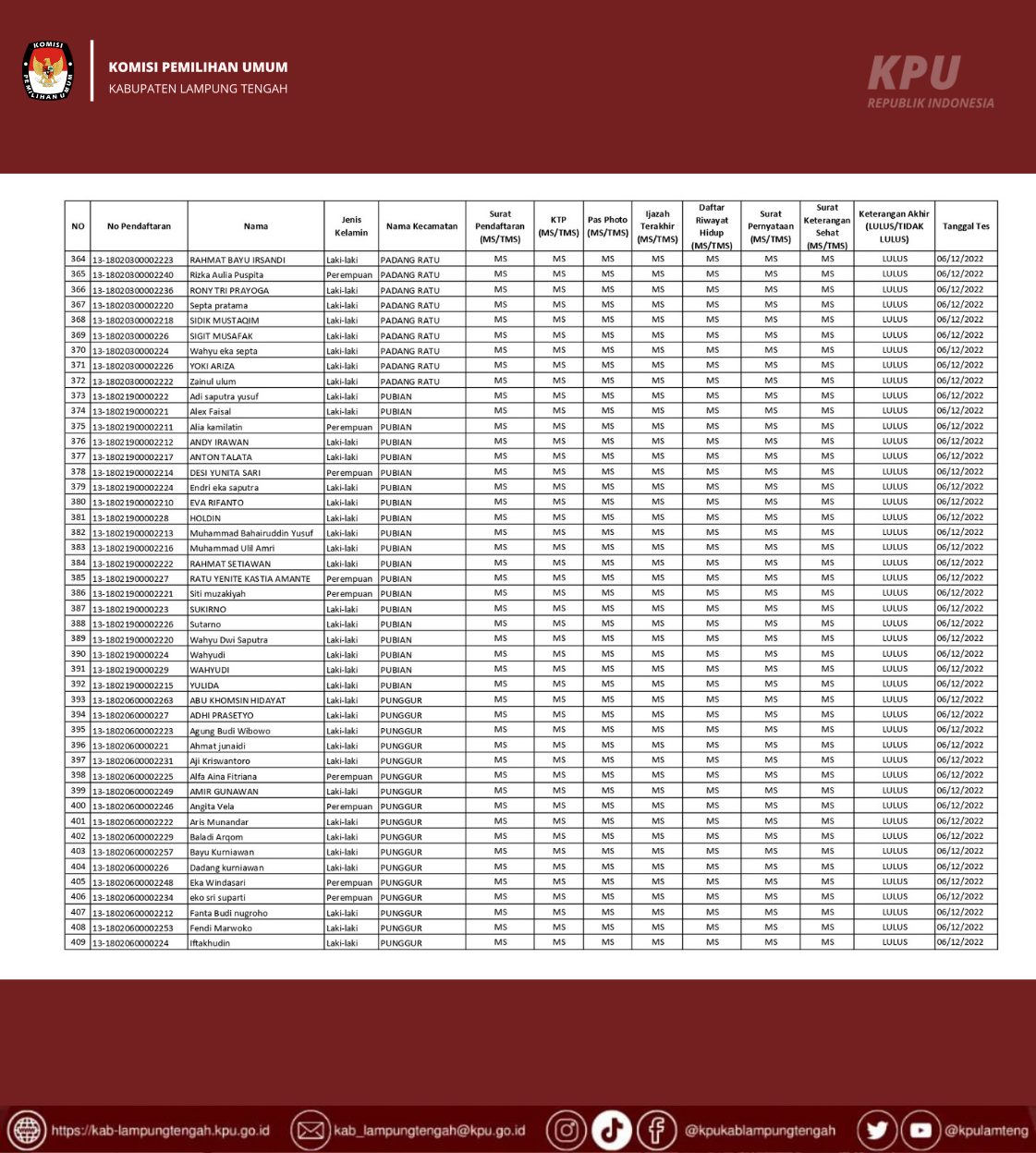 #temanpemilih, Setelah melalui pendaftaran secara online melalui SIAKBA dan verifikasi administrasi Calon Anggota PPK untuk Pemilu Tahun 2024. Maka KPU Kabupaten Lampung Tengah Mengumumkan Hasil Seleksi Administrasi Bagi Calon Anggota PPK dengan Hasil terlampir.