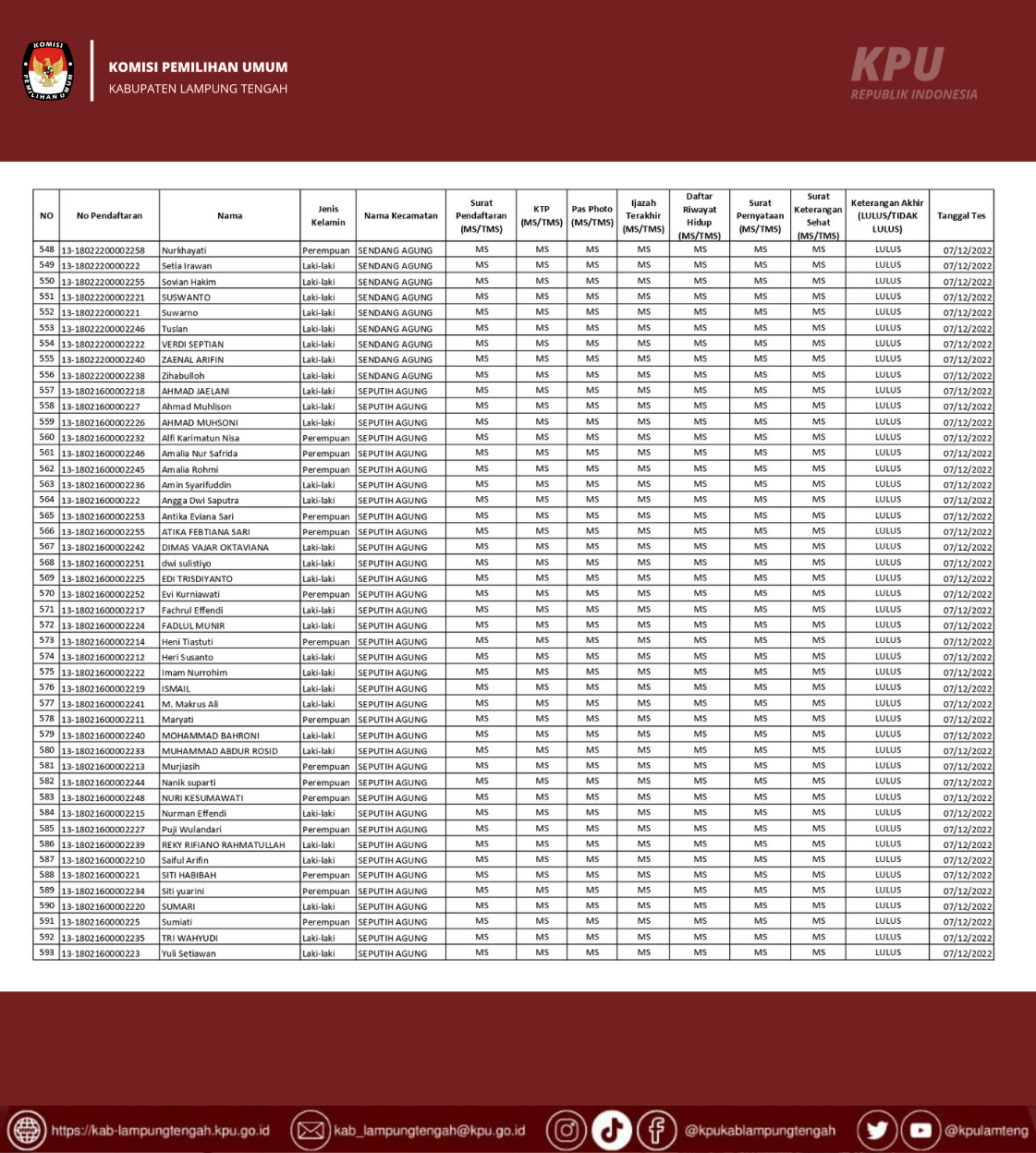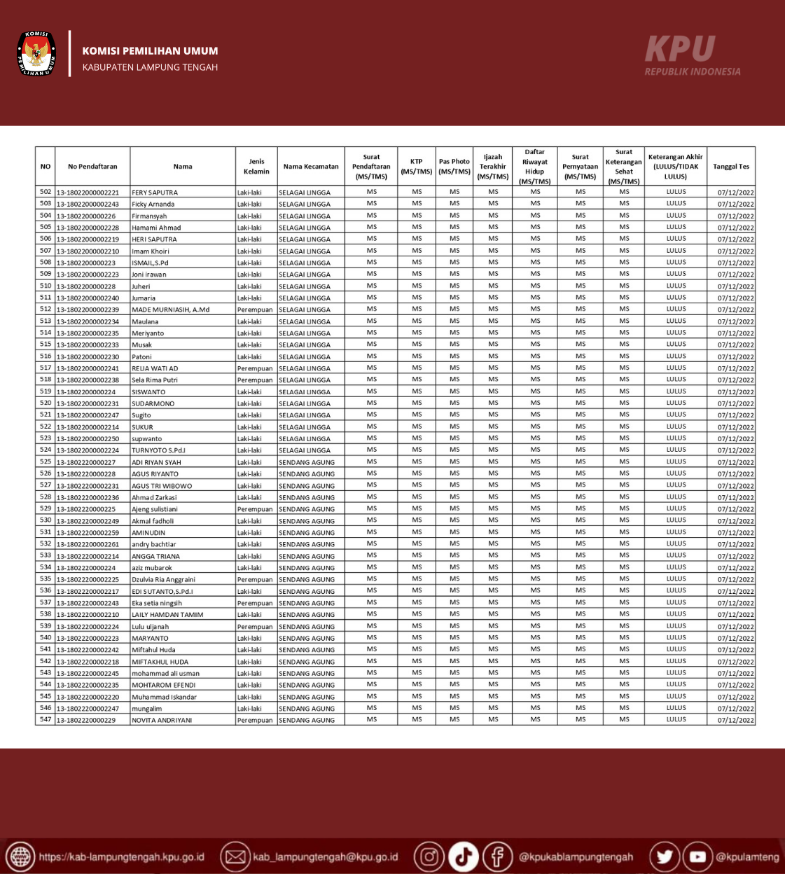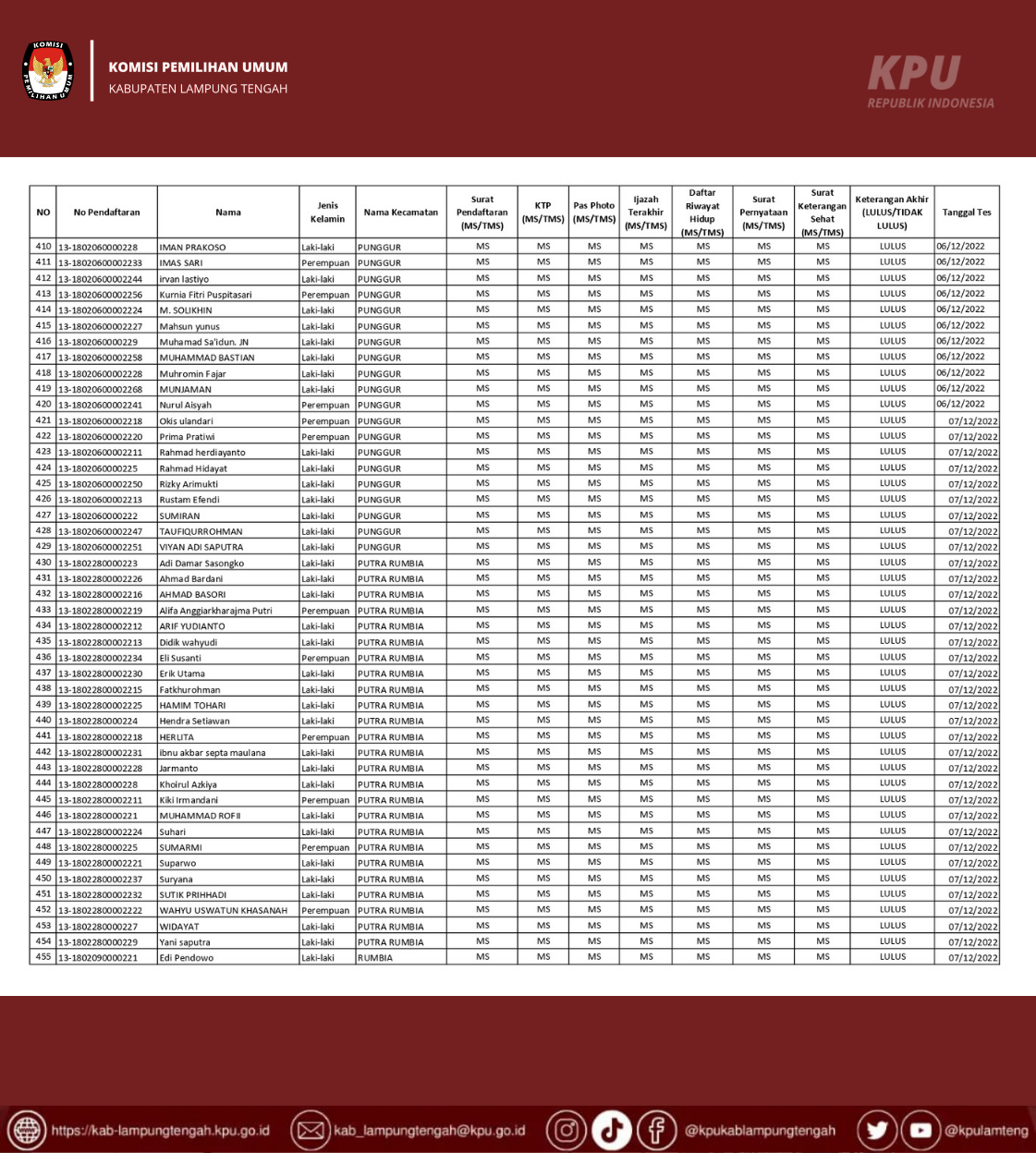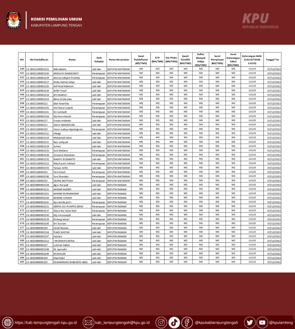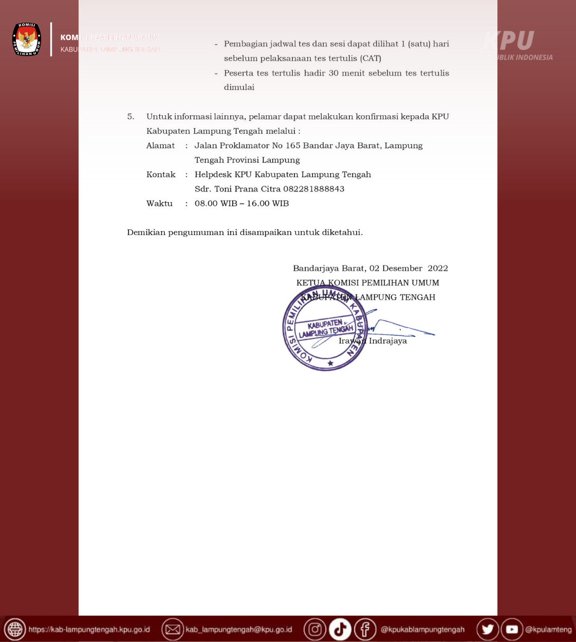 #temanpemilih, Setelah melalui pendaftaran secara online melalui SIAKBA dan verifikasi administrasi Calon Anggota PPK untuk Pemilu Tahun 2024. Maka KPU Kabupaten Lampung Tengah Mengumumkan Hasil Seleksi Administrasi Bagi Calon Anggota PPK dengan Hasil terlampir.