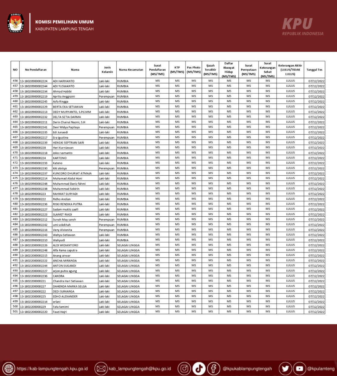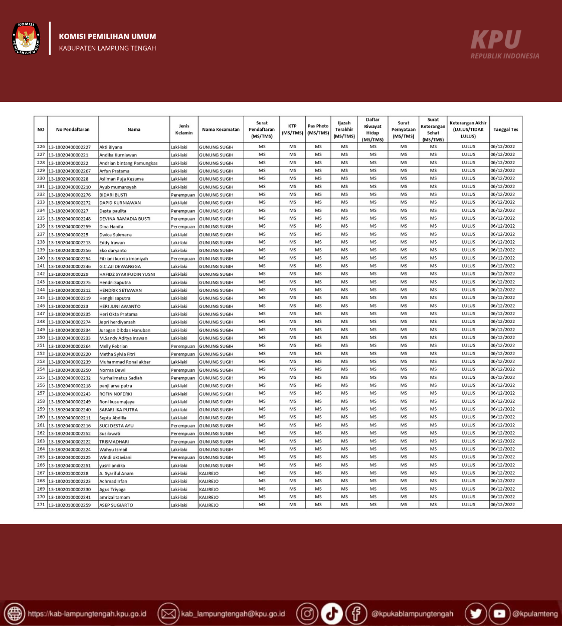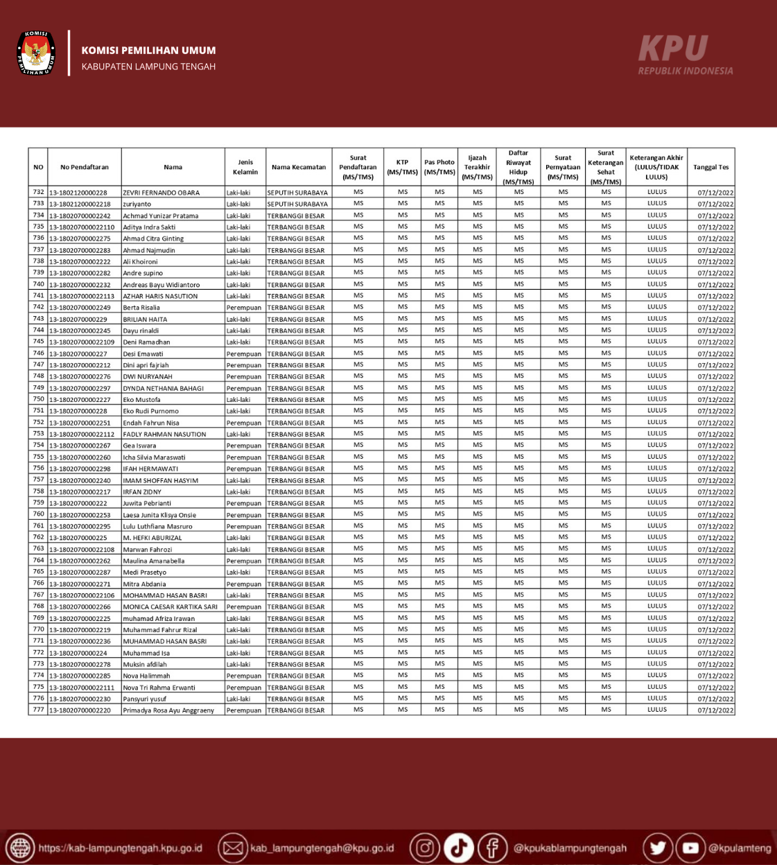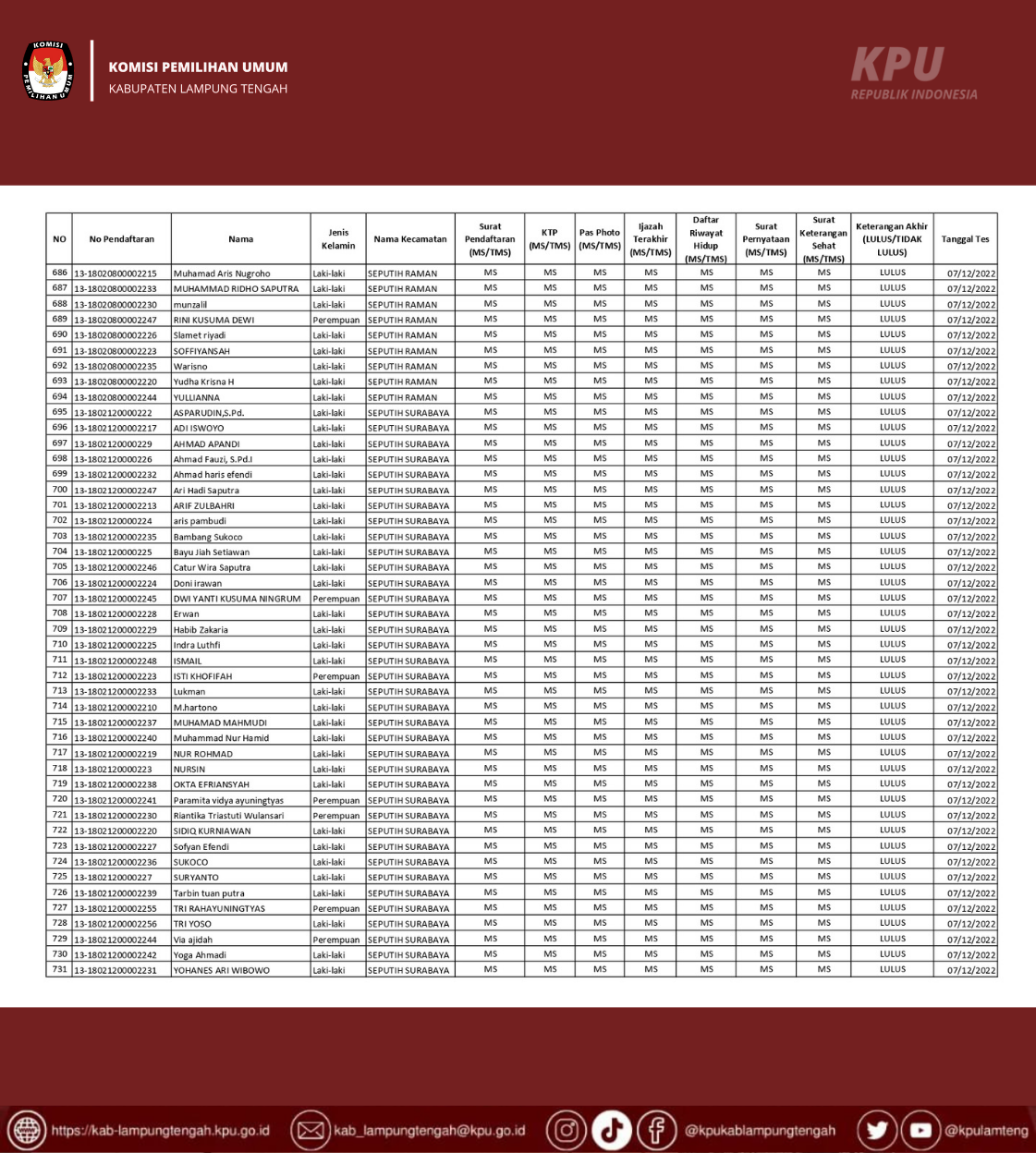 #temanpemilih, Setelah melalui pendaftaran secara online melalui SIAKBA dan verifikasi administrasi Calon Anggota PPK untuk Pemilu Tahun 2024. Maka KPU Kabupaten Lampung Tengah Mengumumkan Hasil Seleksi Administrasi Bagi Calon Anggota PPK dengan Hasil terlampir.