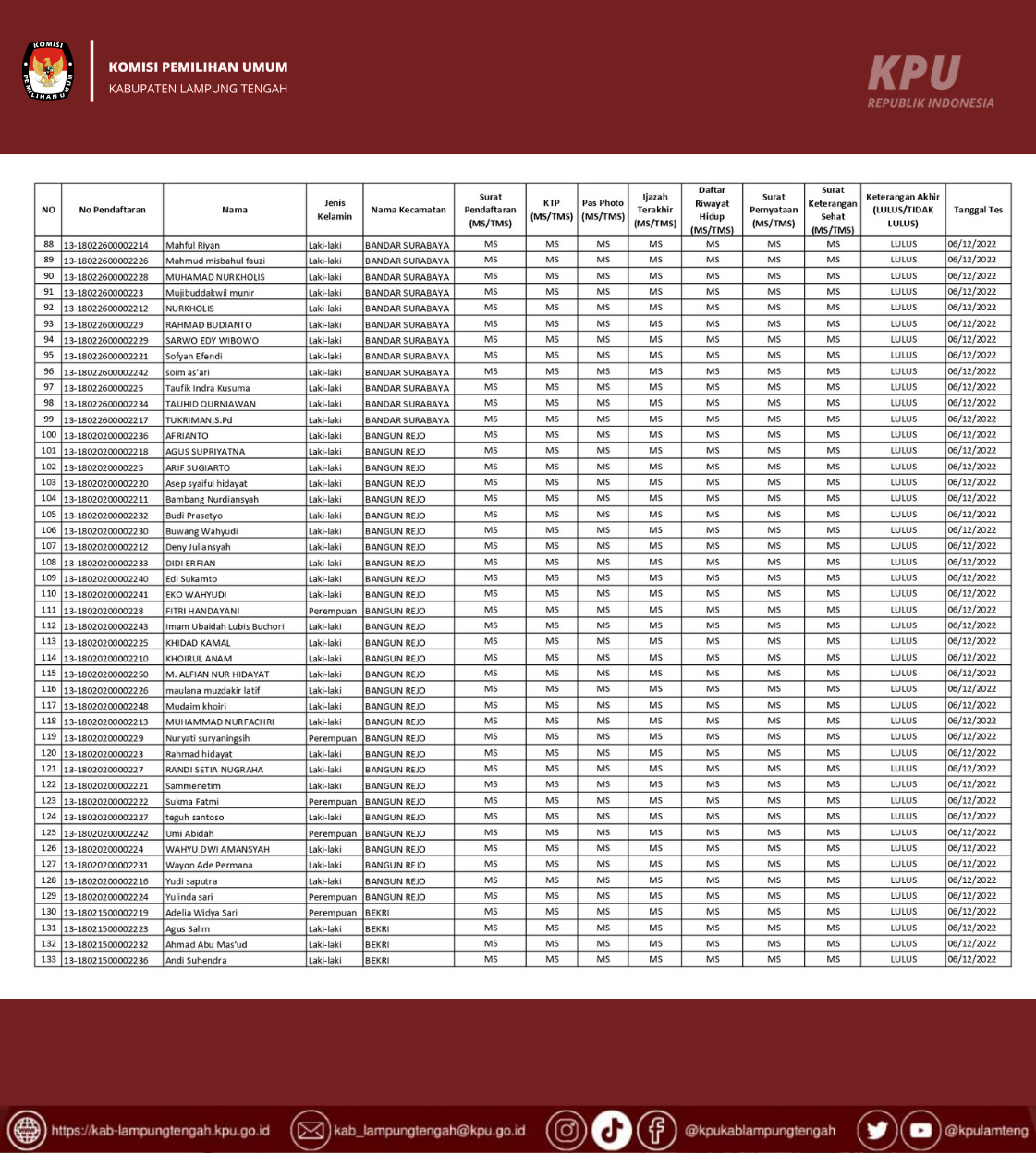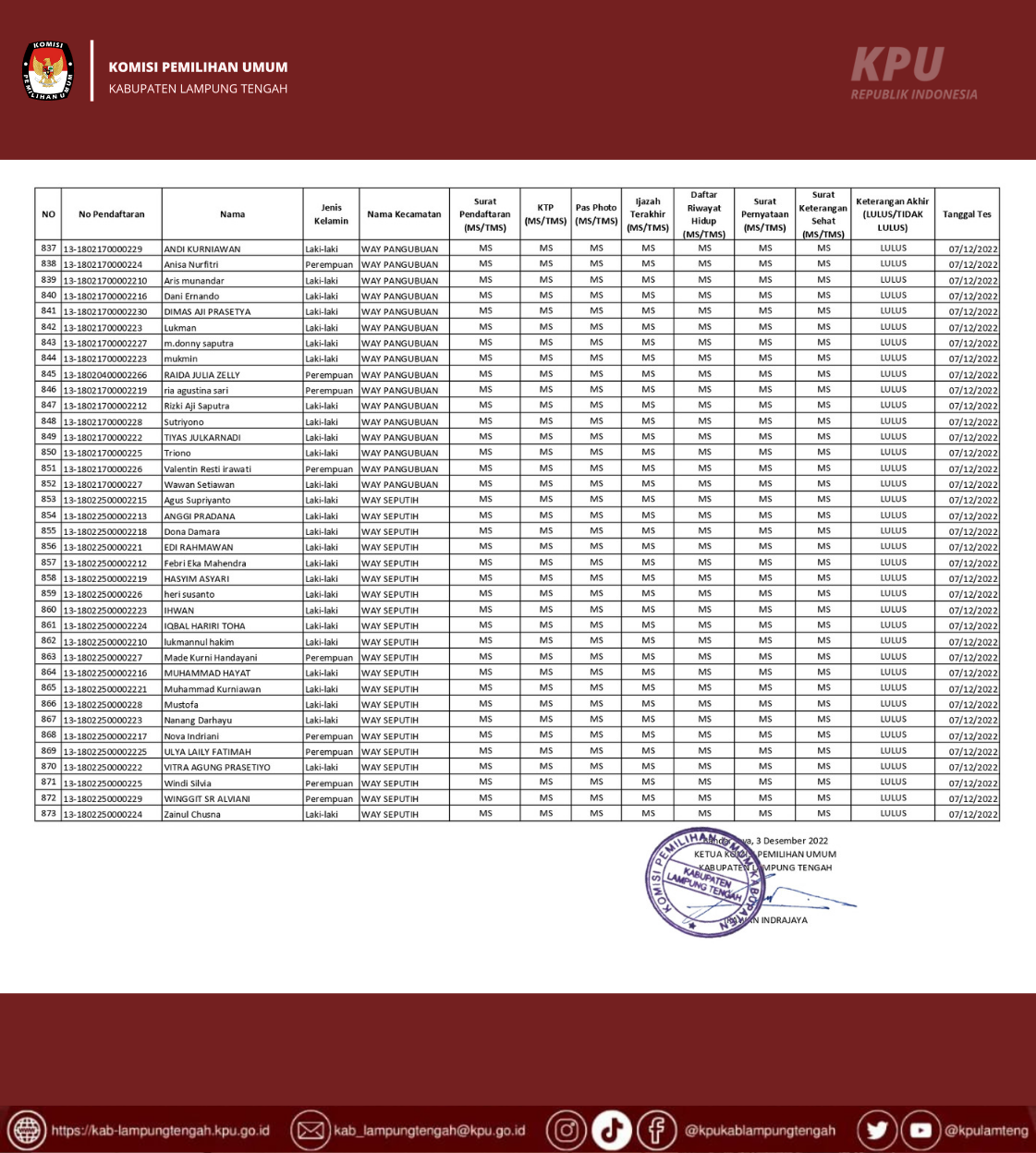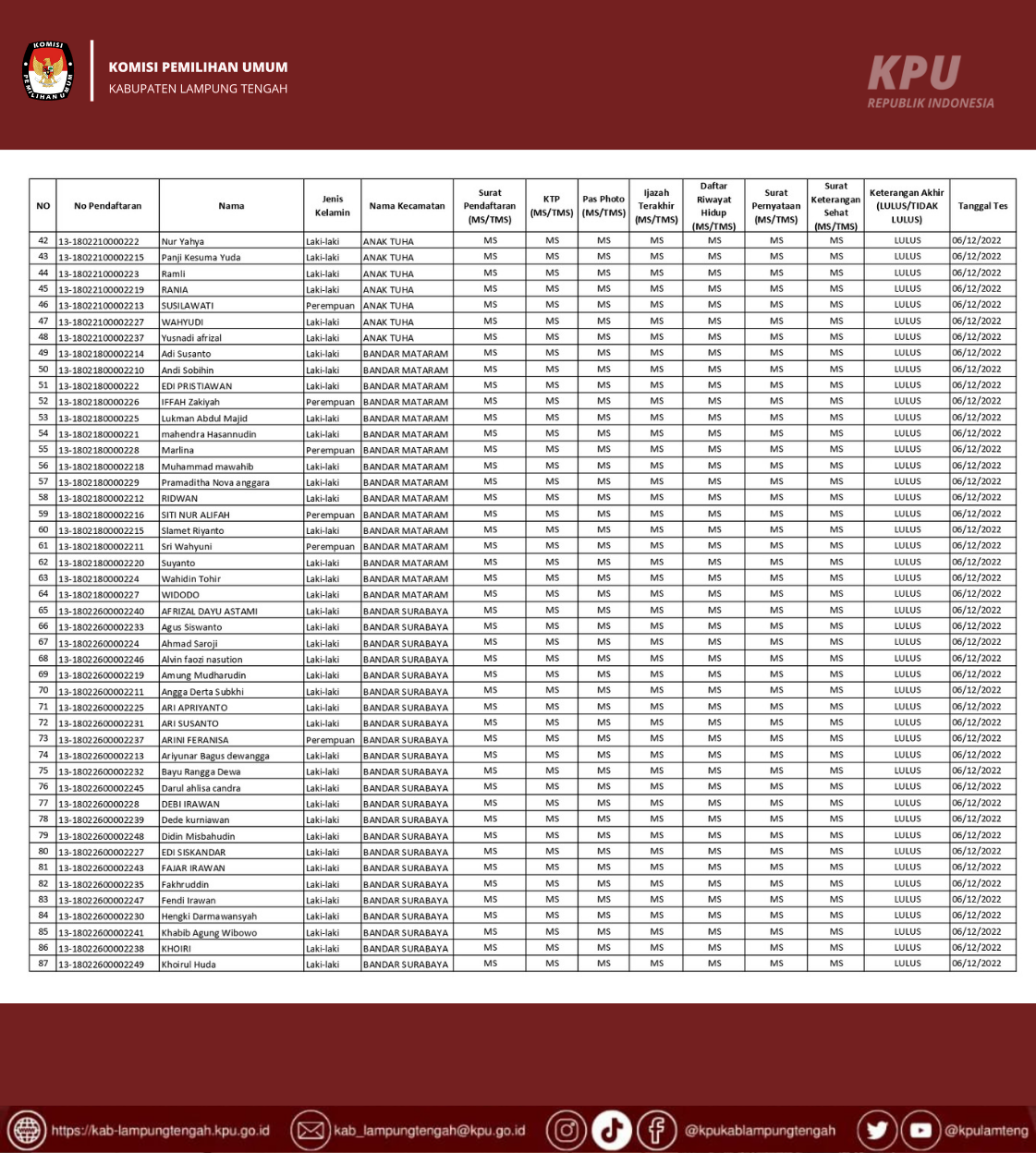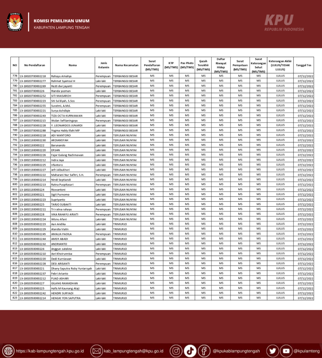 #temanpemilih, Setelah melalui pendaftaran secara online melalui SIAKBA dan verifikasi administrasi Calon Anggota PPK untuk Pemilu Tahun 2024. Maka KPU Kabupaten Lampung Tengah Mengumumkan Hasil Seleksi Administrasi Bagi Calon Anggota PPK dengan Hasil terlampir.