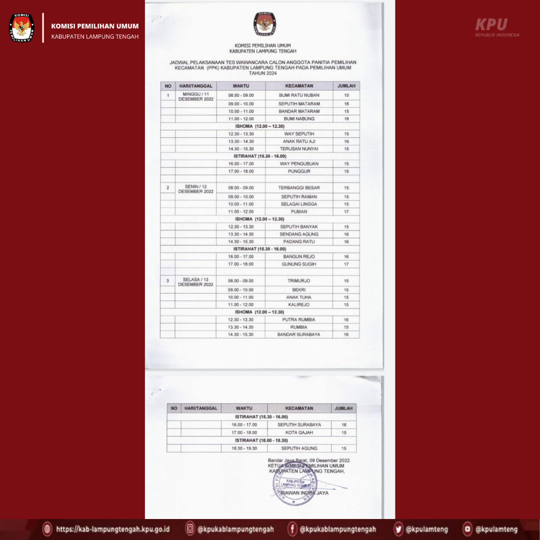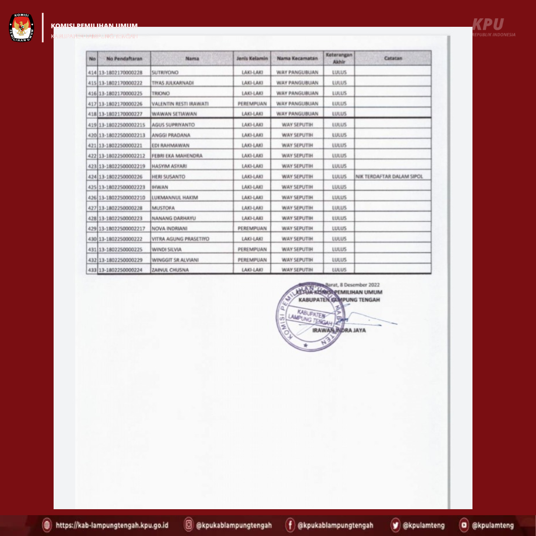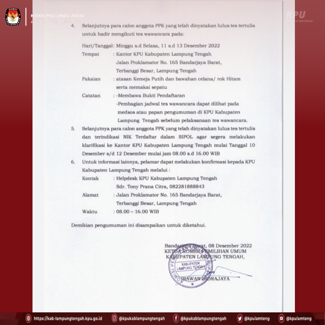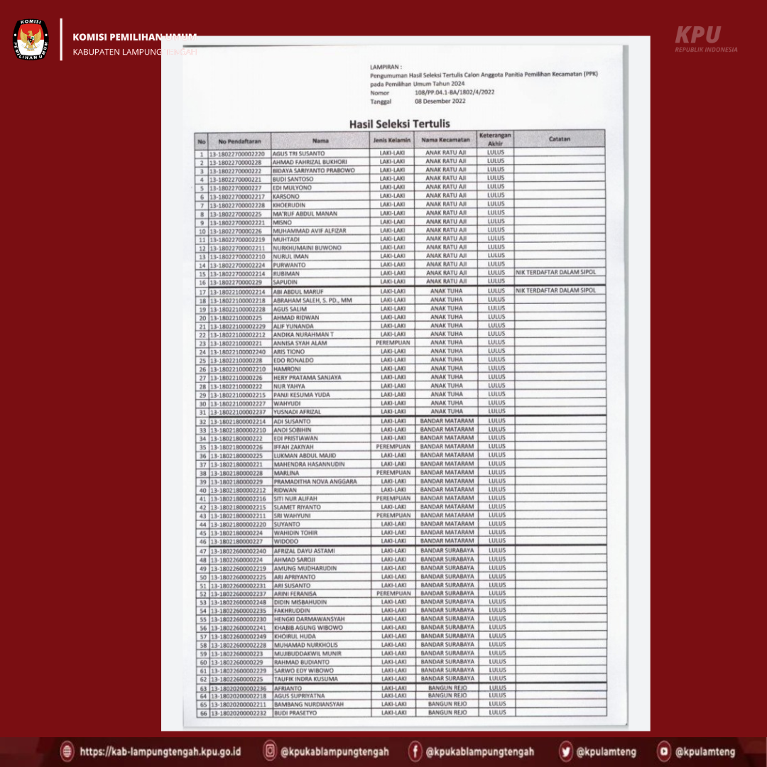 #temanpemilih, Komisi Pemilihan Umum Kabupaten Lampung Tengah telah melaksanakan Tes tertulis melalui CAT (Computer Assisted Test) pada tanggal 6-7 Desember 2022 kepada Calon Anggota PPK untuk Pemilu Tahun 2024. Komisi Pemilihan Umum Kabupaten Lampung Tengah Mengumumkan Hasil Seleksi CAT tersebut Bagi Calon Anggota PPK dengan Hasil terlampir.