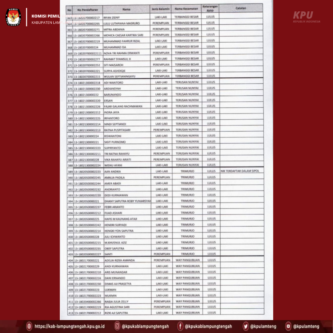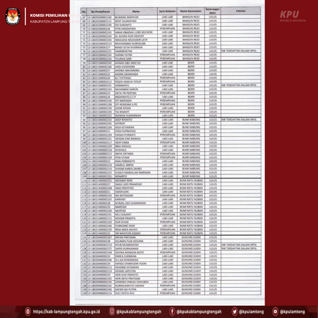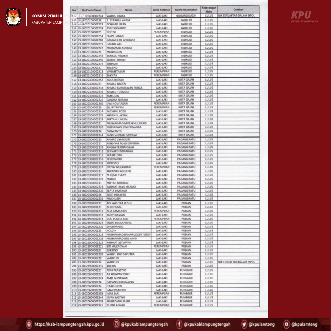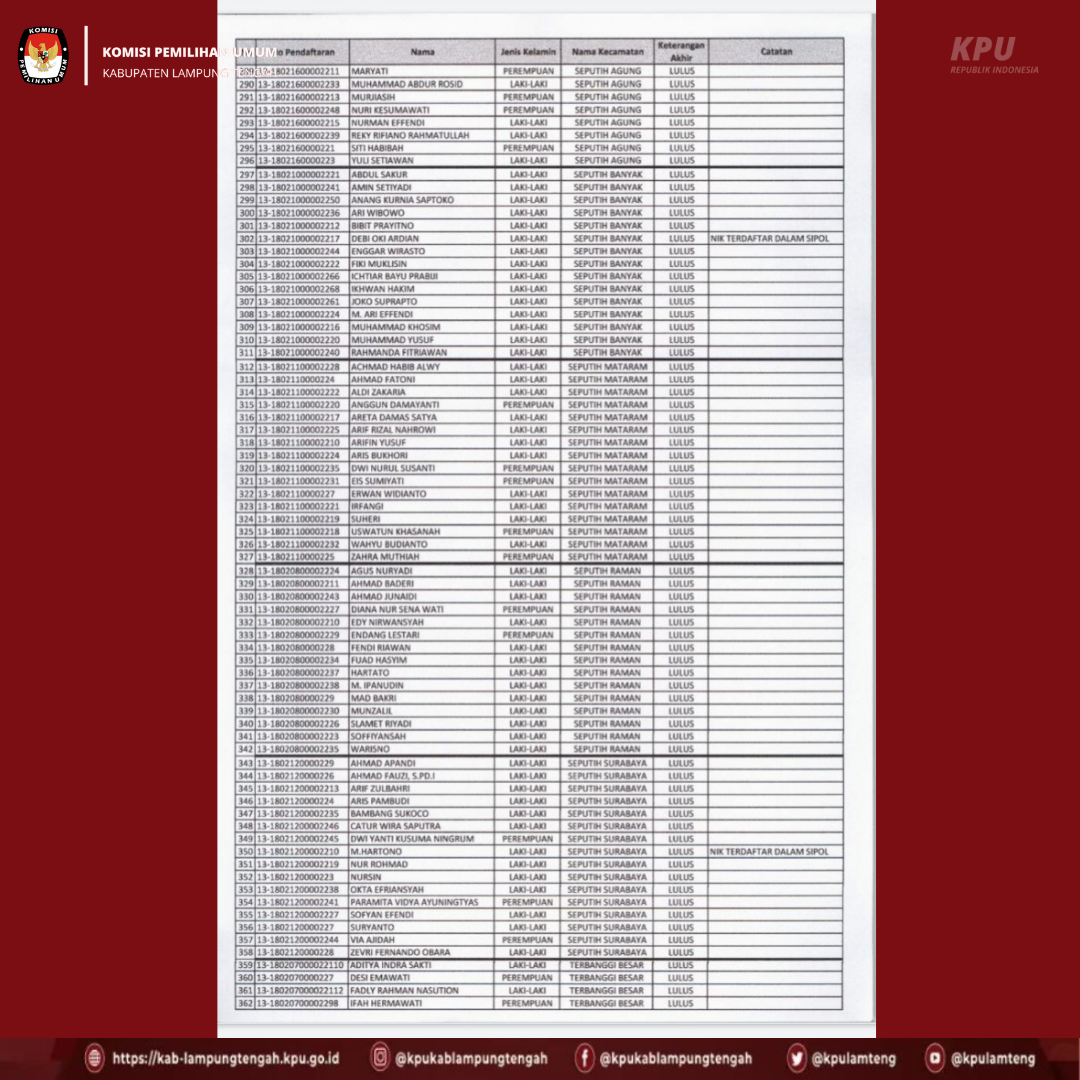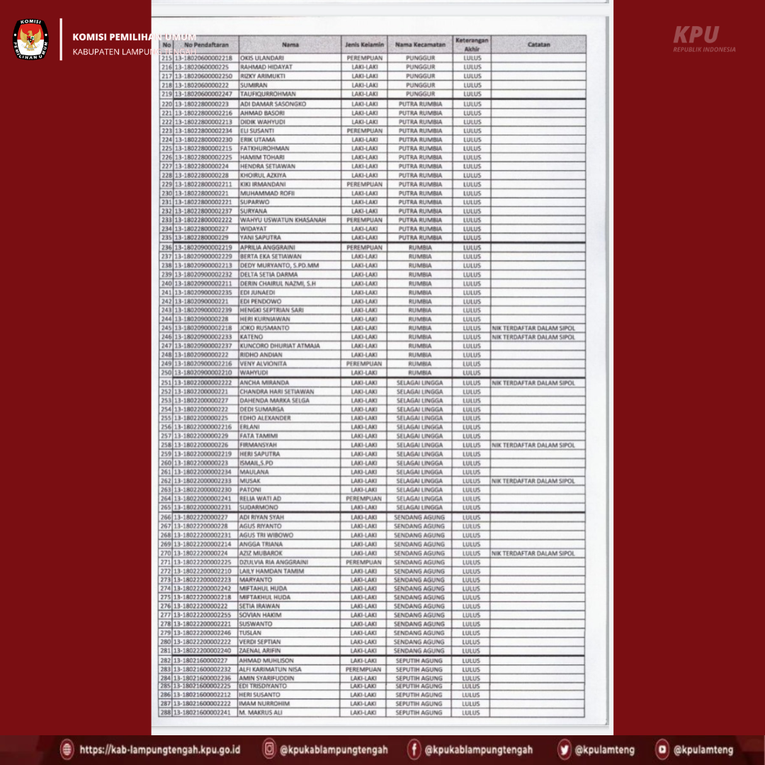 #temanpemilih, Komisi Pemilihan Umum Kabupaten Lampung Tengah telah melaksanakan Tes tertulis melalui CAT (Computer Assisted Test) pada tanggal 6-7 Desember 2022 kepada Calon Anggota PPK untuk Pemilu Tahun 2024. Komisi Pemilihan Umum Kabupaten Lampung Tengah Mengumumkan Hasil Seleksi CAT tersebut Bagi Calon Anggota PPK dengan Hasil terlampir.
