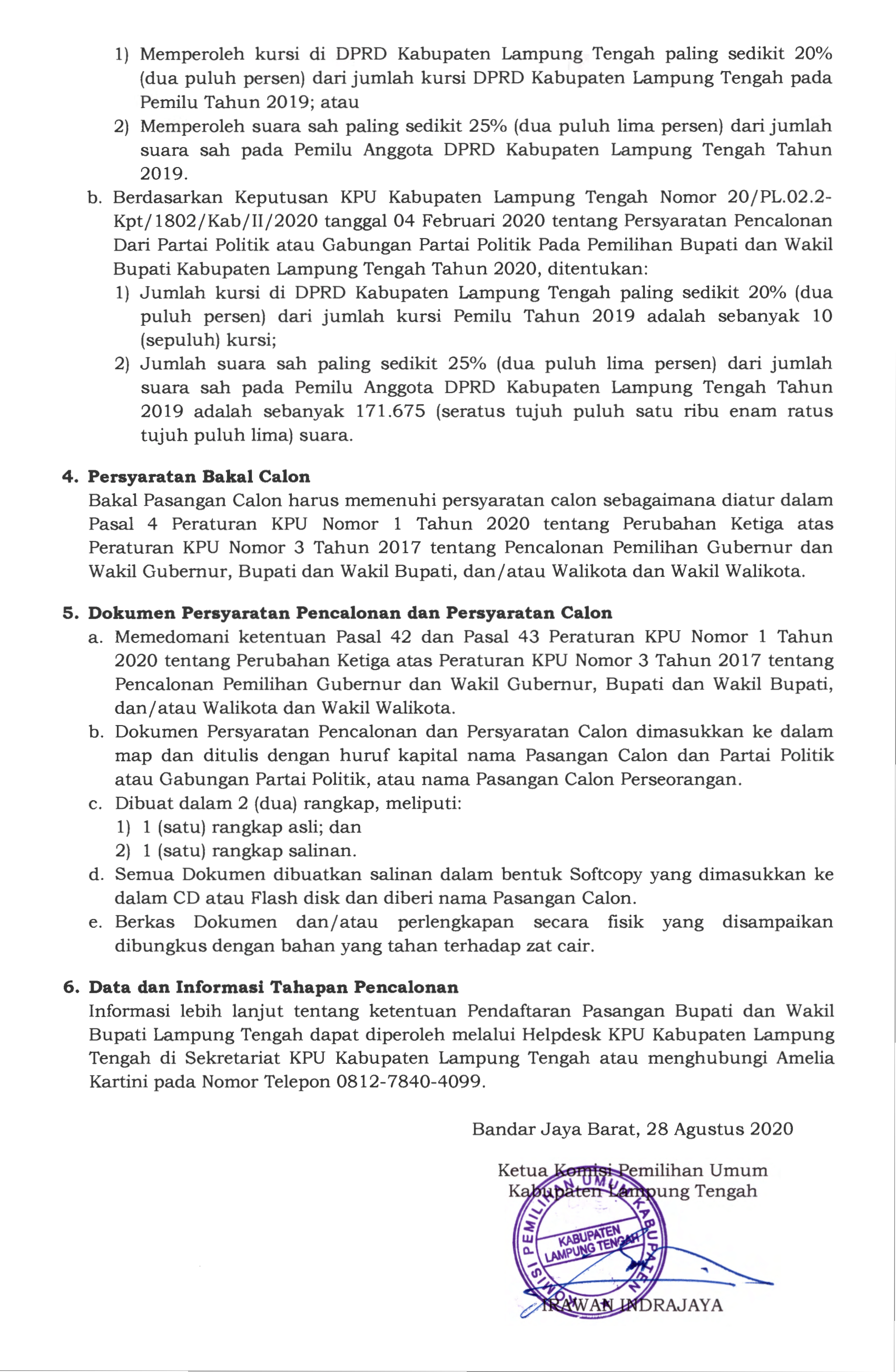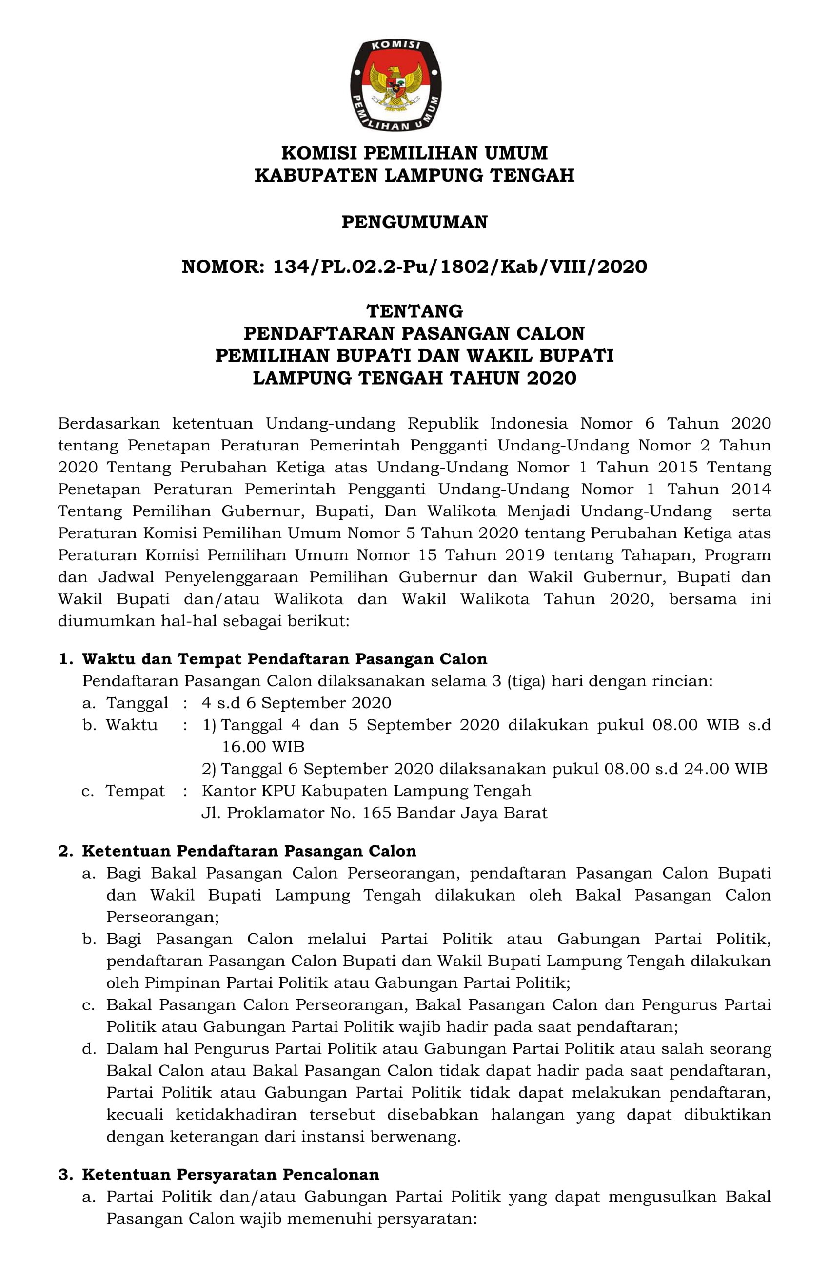 Pengumuman Pendaftaran Pasangan Calon Pemilihan Bupati dan Wakil Bupati Lampung Tengah Tahun 2020.