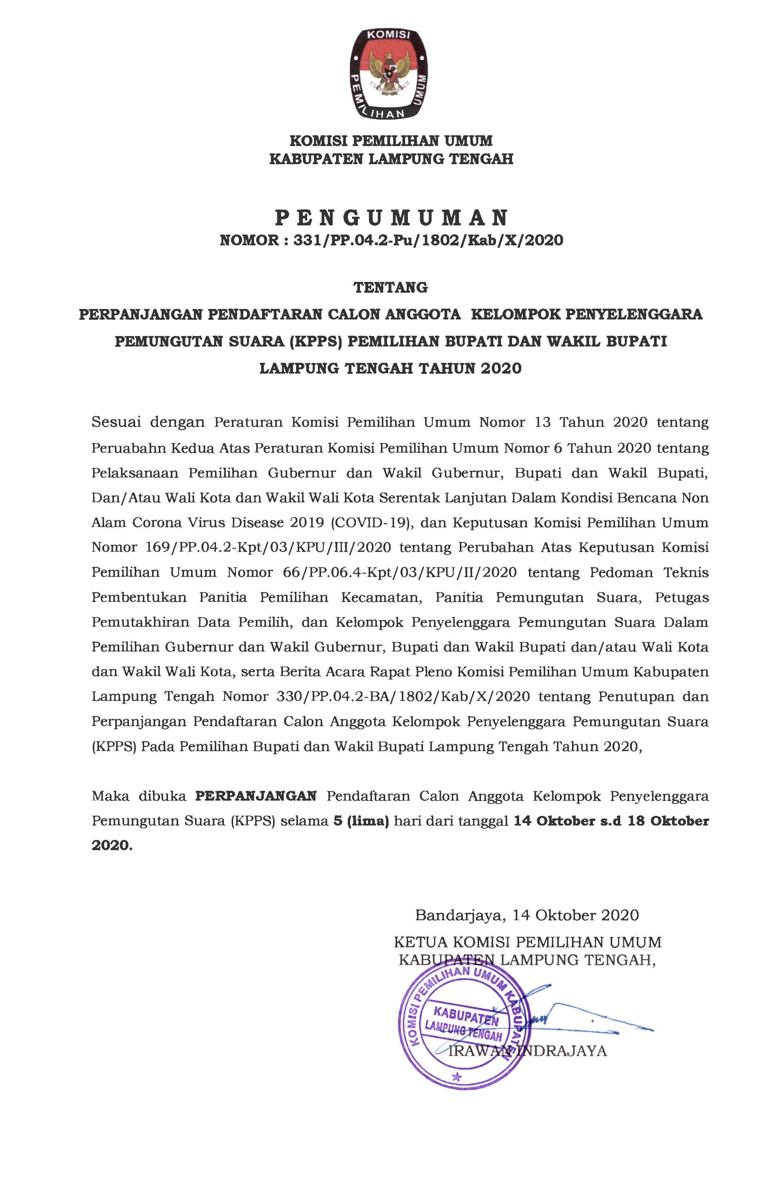 Pengumuman Perpanjangan Pendaftaran Calon Anggota KPPS Pemilihan Bupati dan Wakil Bupati Lampung Tengah Tahun 2020