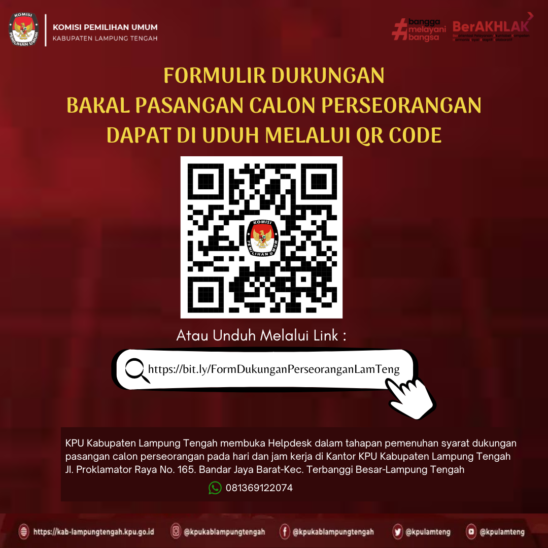 Formulir surat pernyataan dukungan Bakal Pasangan Calon Perseorangan dalam Pemilihan Bupati dan Wakil Bupati Kabupaten Lampung Tengah Tahun 2024 dapat diunduh dengan mengakses barcode berikut atau melalui link Klik Disini.