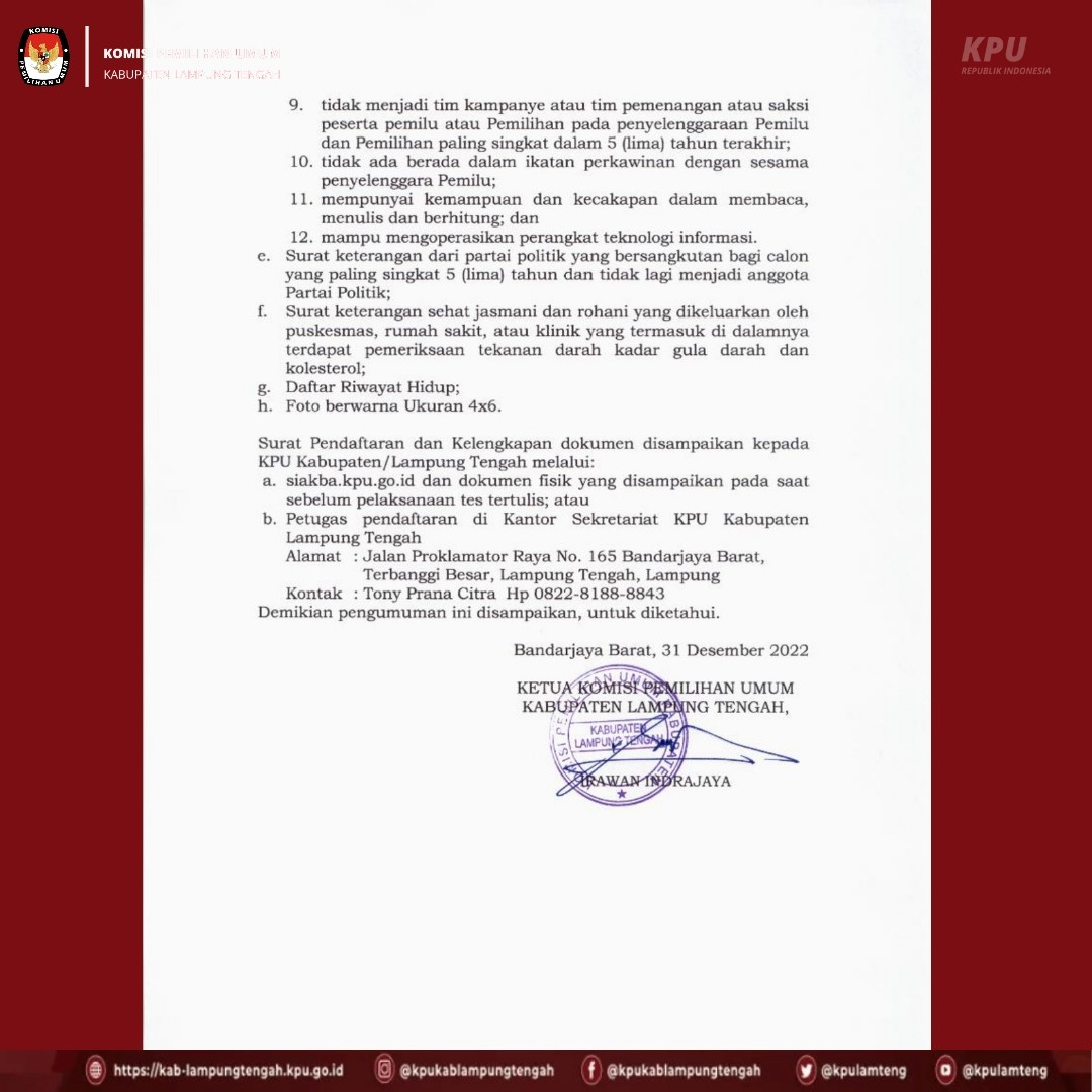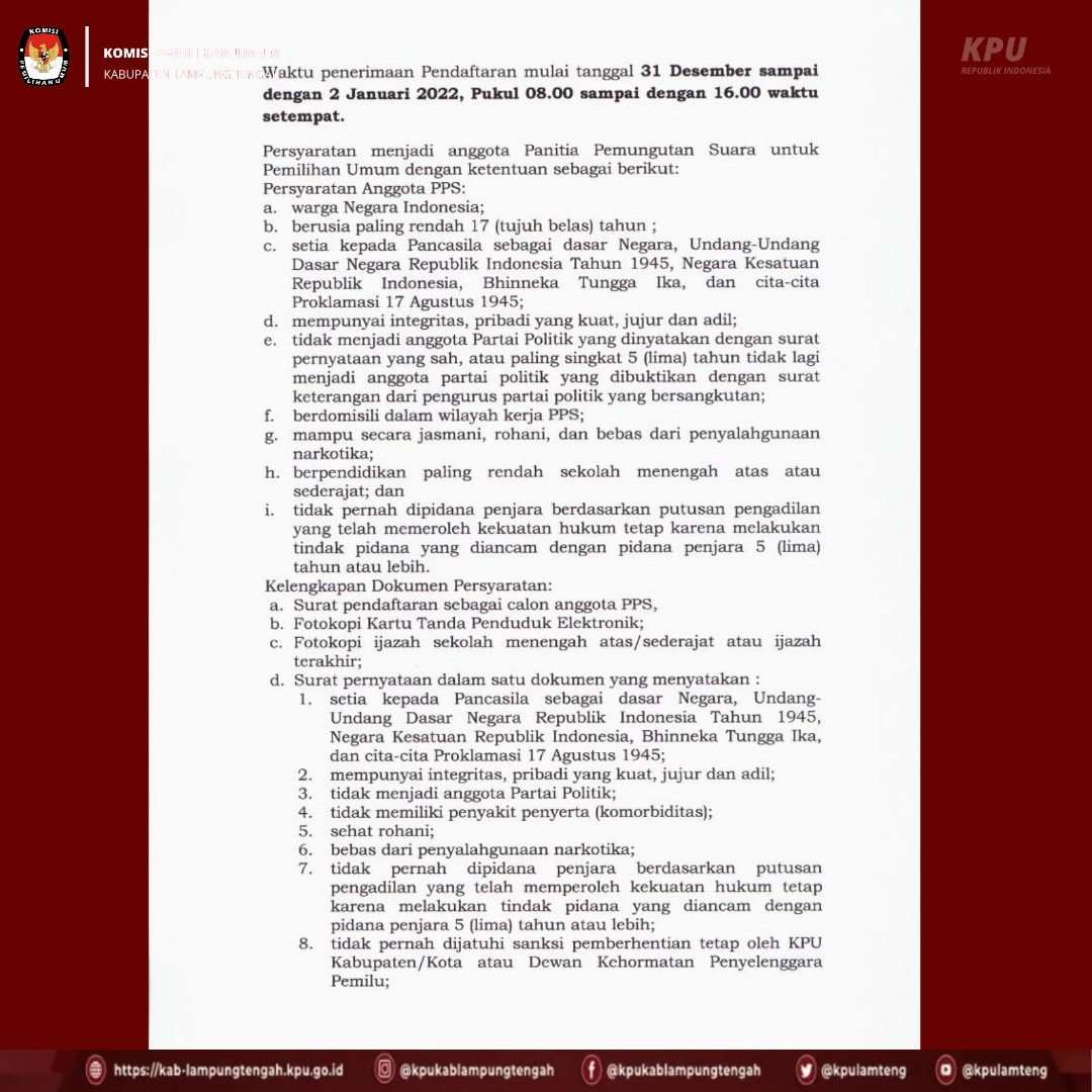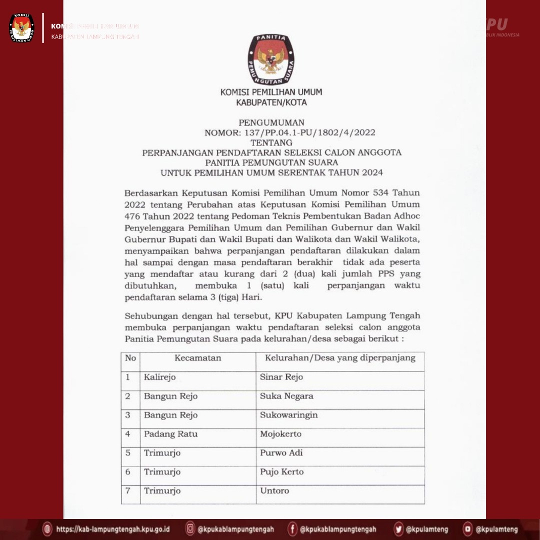 Perpanjangan Perdaftaran Calon Anggota PPS Sabtu, 31 Desember 2022 00:00 396 #TemanPemilih, Pengumuman Perpanjangan Pendaftaran Seleksi Calon Anggota Panitia Pemungutan Suara (PPS) Pemilu Tahun 2024. #KPUMelayani #KPULamTeng #PemiluSerentak2024 Bagikan: Telah dilihat 396 kali