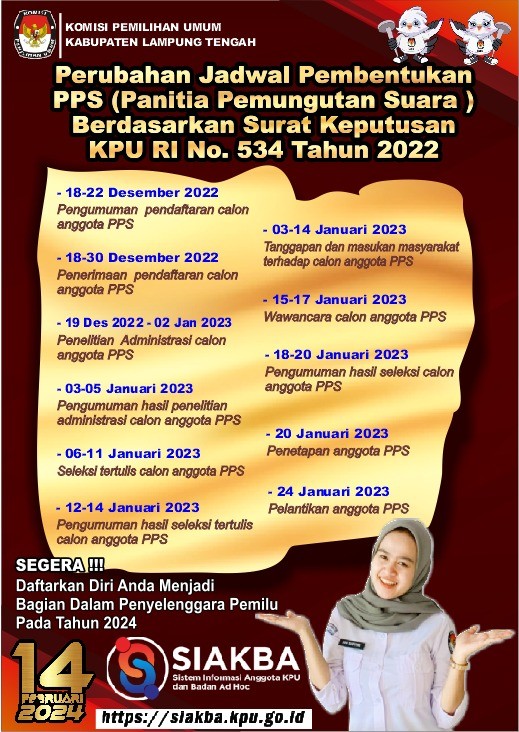 Berdasarkan Surat Keputusan KPU No. 534 tahun 2022 Jadwal Penerimaan Badan Ad-hoc Anggota Panitia Pemungutan Suara (PPS) berubah seperti terlampir.