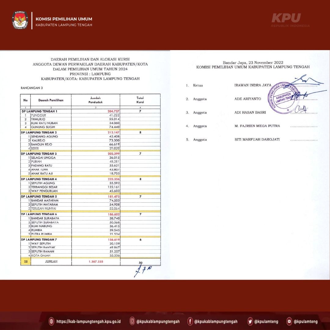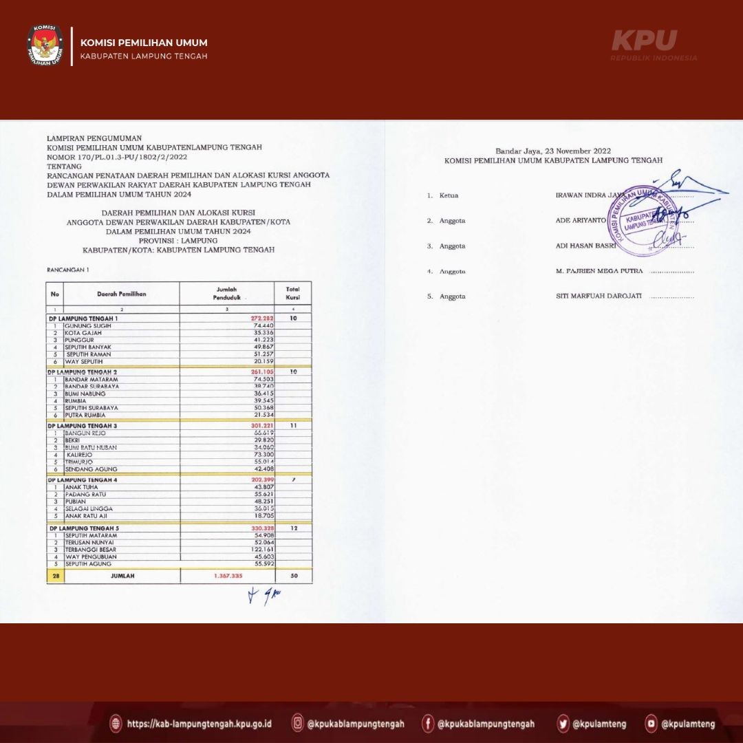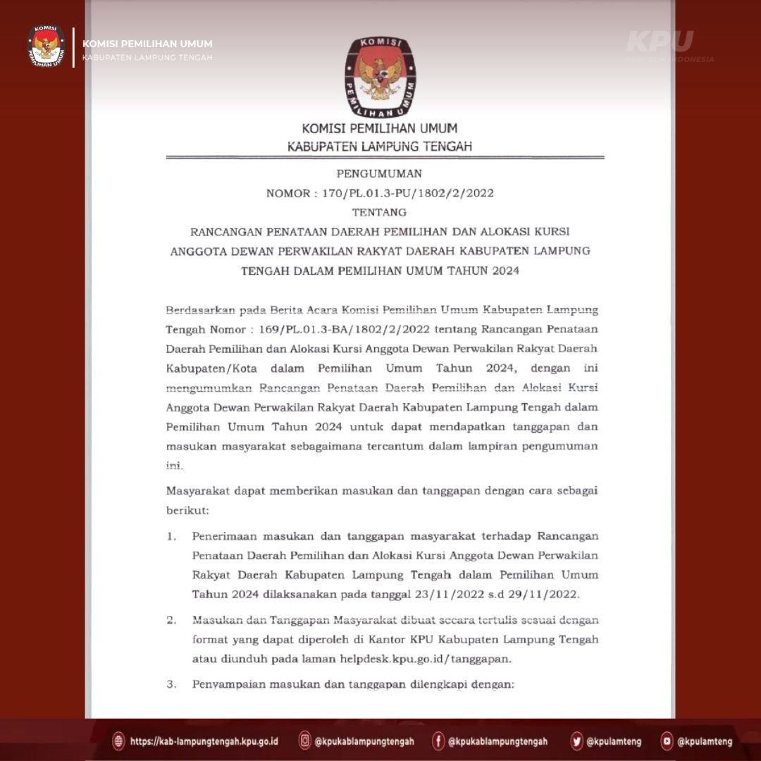 #TemanPemilih berikut ini kami sampaikan PENGUMUMAN tentang Rancangan Penataan Dapil dan Alokasi Kursi DPRD kabupaten Lampung Tengah dalam Pemilihan Umum tahun 2024.