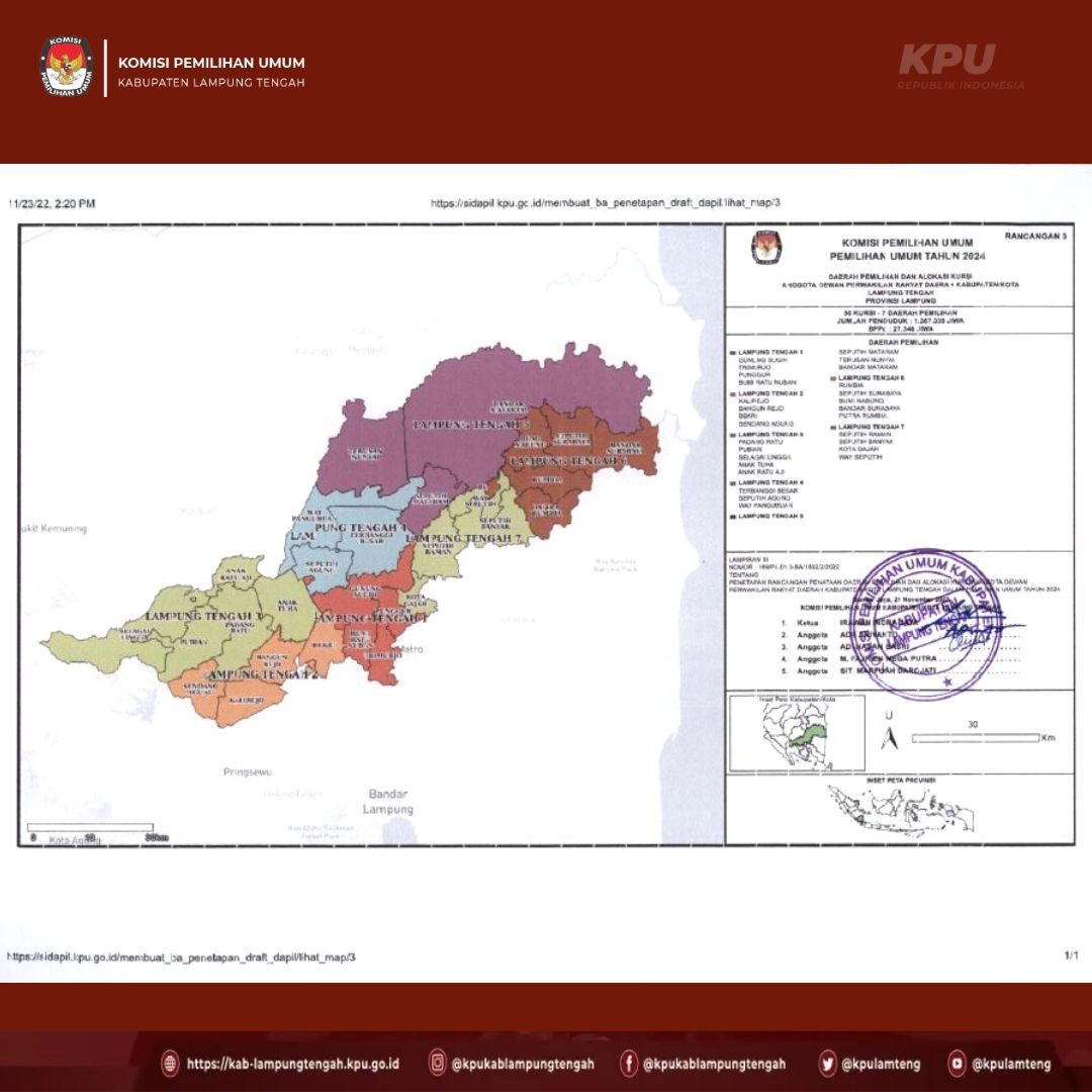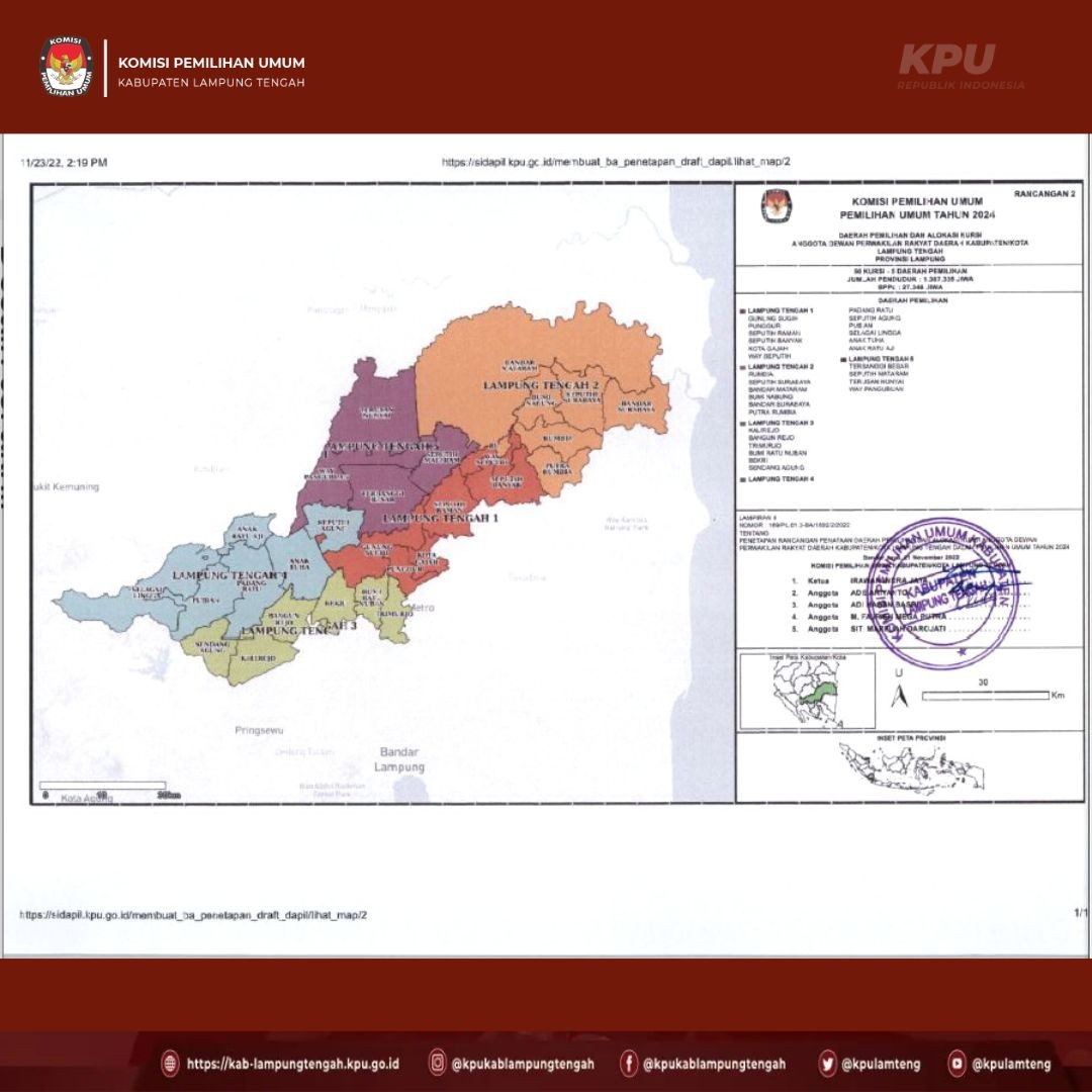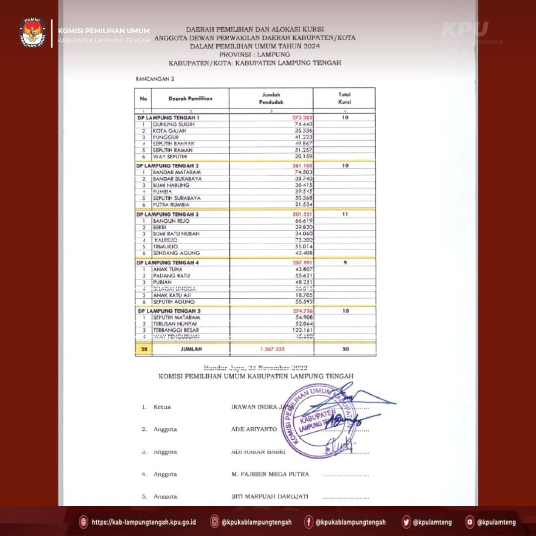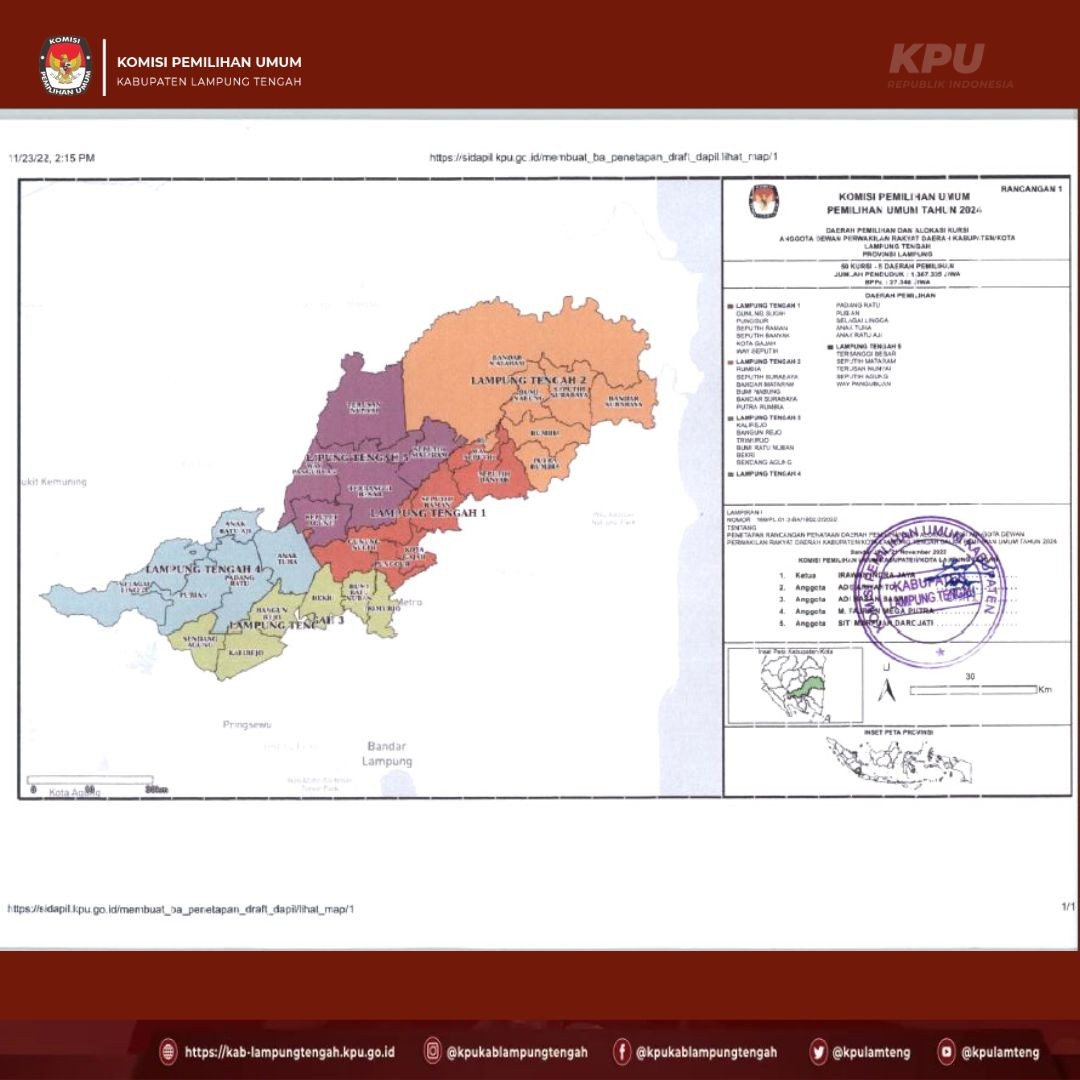 #TemanPemilih berikut ini kami sampaikan PENGUMUMAN tentang Rancangan Penataan Dapil dan Alokasi Kursi DPRD kabupaten Lampung Tengah dalam Pemilihan Umum tahun 2024.