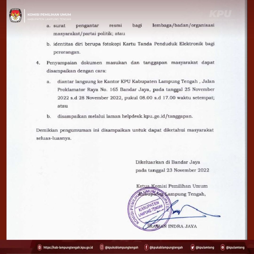 Mengenai Hal tersebut diatas KPU Kabupaten Lampung Tengah menerima masukan dan tanggapan Masyarakat mulai tanggal 25 November - 28 November 2022 dengan formulir dapat diambil di KPU Kabupaten Lampung Tengah atau dapat mengunduh di laman https://helpdesk.kpu.go.id/tanggapan