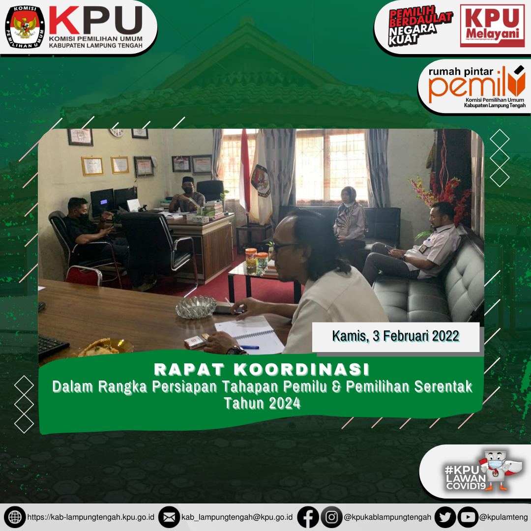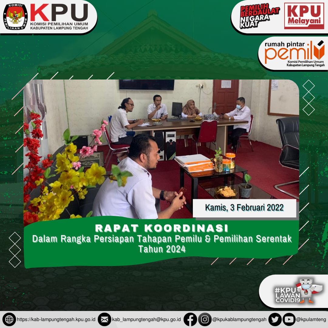 KPU Kabupaten Lampung Tengah melaksanakan Kegiatan Rapat Koordinasi dalam rangka Persiapan Tahapan Pemilu dan Pemilihan Serentak Tahun 2024, Kamis (03/02/2022). Kegiatan rakor dihadiri oleh jajaran Komisioner, Sekretaris, Kasubbag dan Bendahara KPU Kabupaten Lampung Tengah.