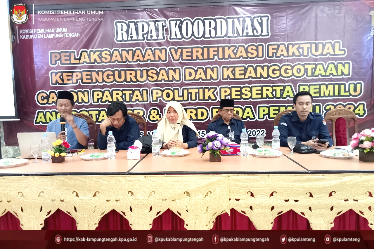 #TemanPemilih, Komisi Pemilihan Umum Kabupaten Lampung Tengah menyelenggarakan Rapat Koordinasi Persiapan Verifikasi Faktual Kepengurusan dan Keanggotaan Partai Politik Calon Peserta Pemilu 2024 pada Sabtu (15/10) bertempat di Rumah Makan Siang Malam, Bandar Jaya.