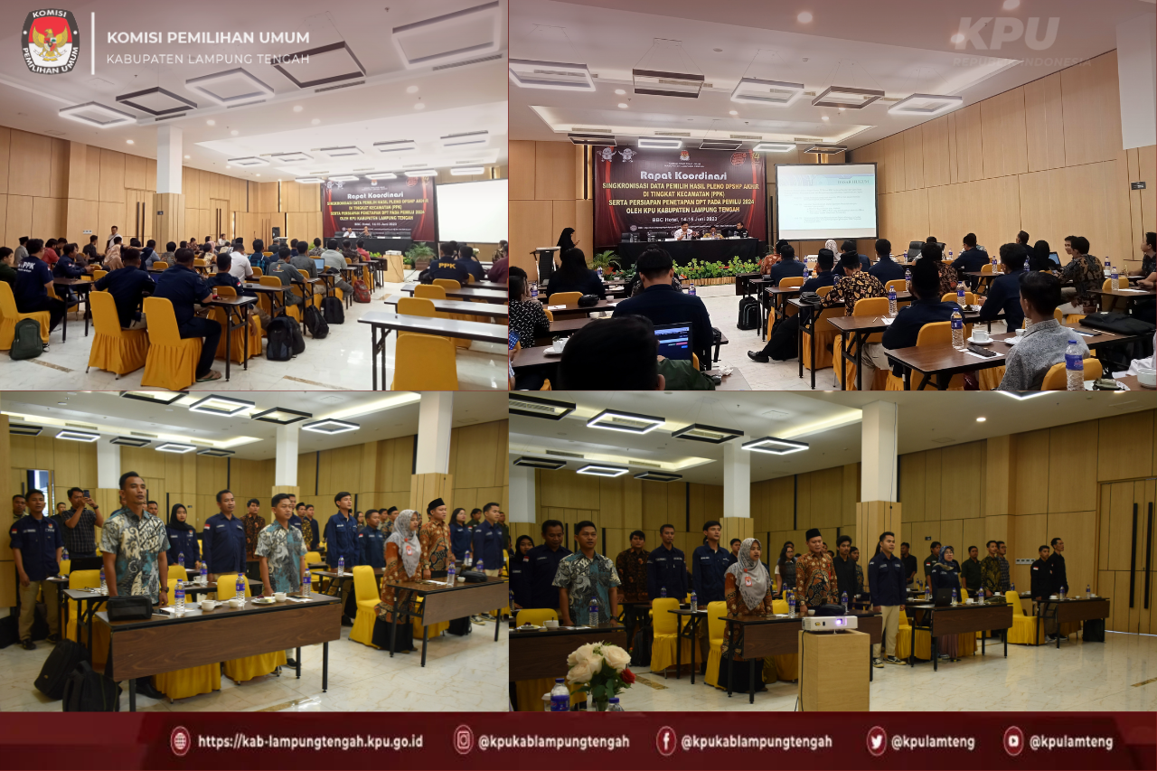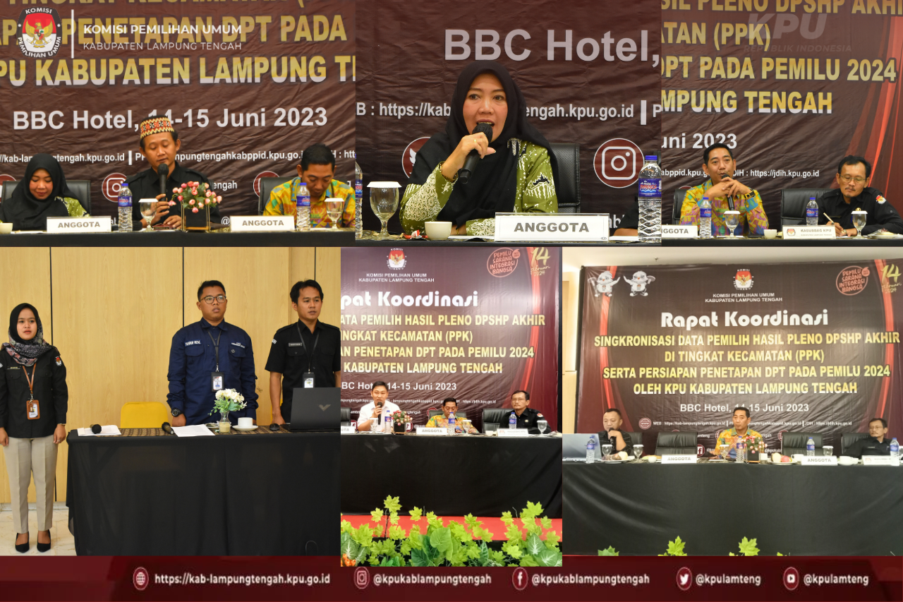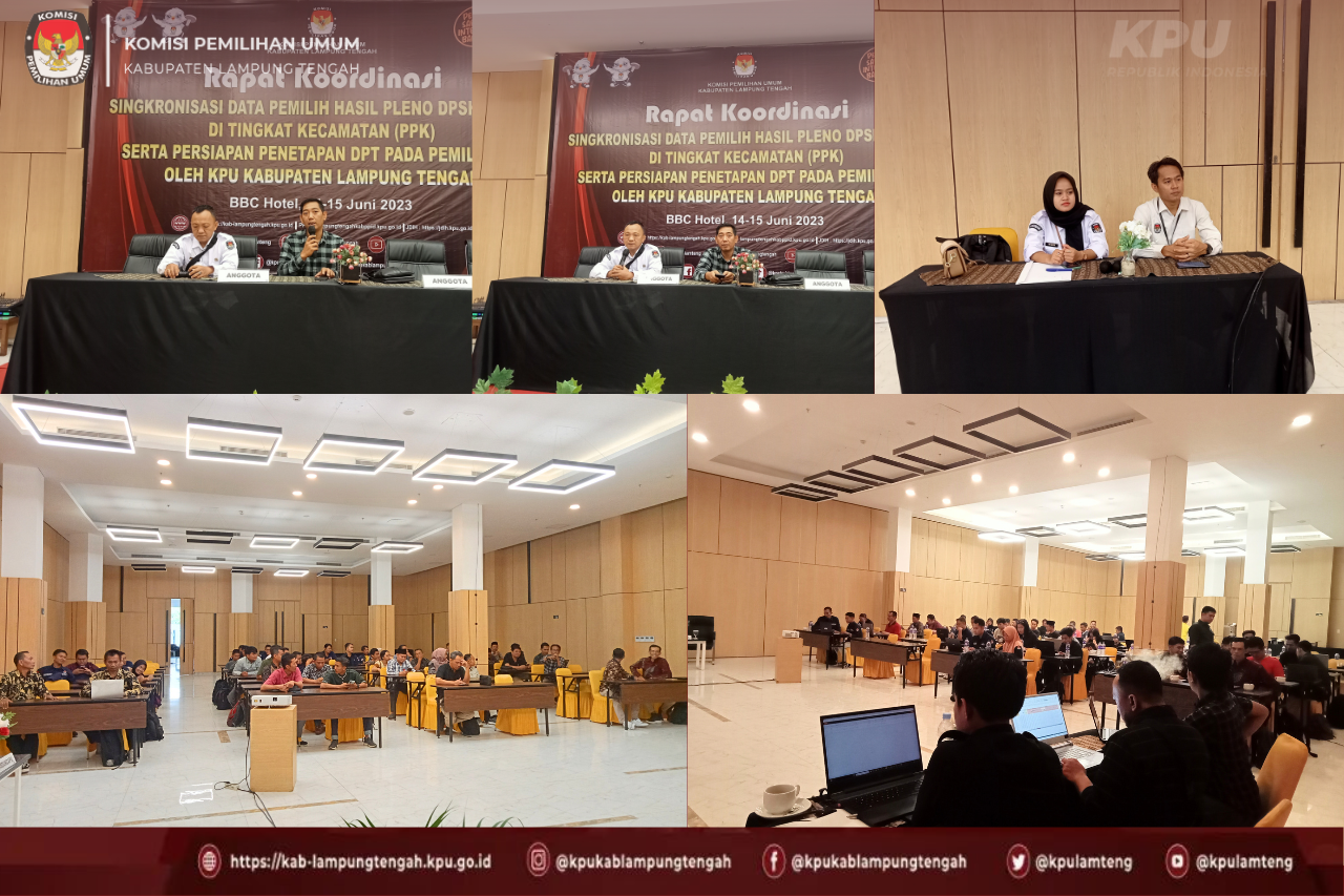 #TemanPemilih, Komisi Pemilihan Umum Kabupaten Lampung Tengah menyelenggarakan Kegiatan Rapat Koordinasi Singkronisasi Data Pemilih Hasil Pleno DPSHP Akhir di Tingkat Kecamatan (PPK) Serta Persiapan Penetapan DPT Pada Pemilu 2024 Oleh KPU Kabupaten Lampung Tengah bersama dengan Panitia Pemilihan Kecamatan (PPK) se-Kabupaten Lampung Tengah di BBC Hotel Bandar Jaya pada tanggal 14 s.d 15 Juni 2023.