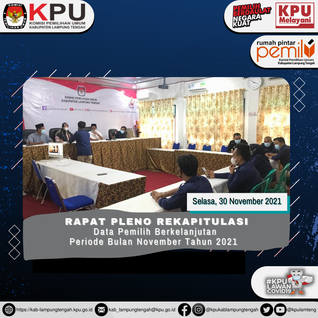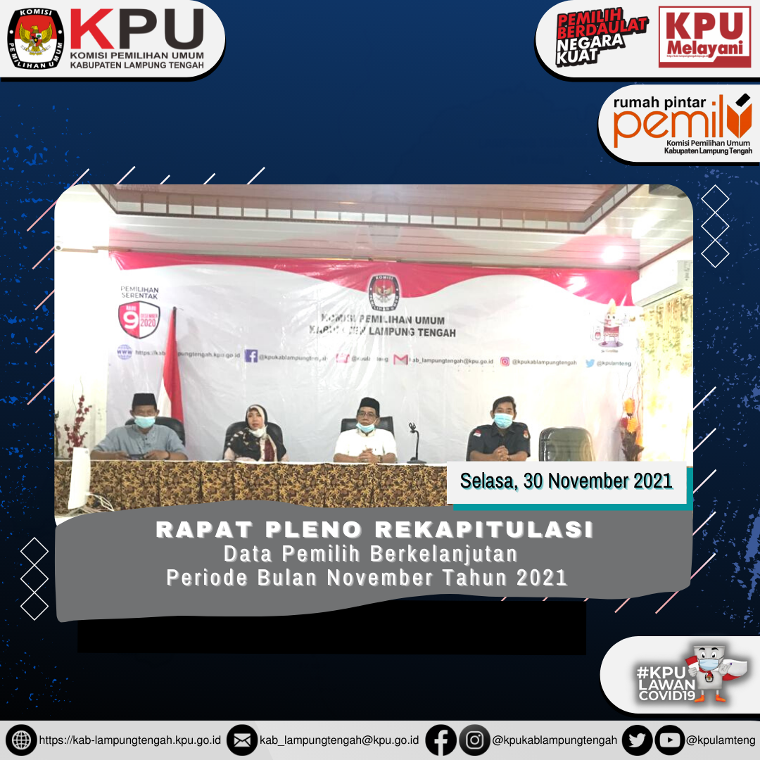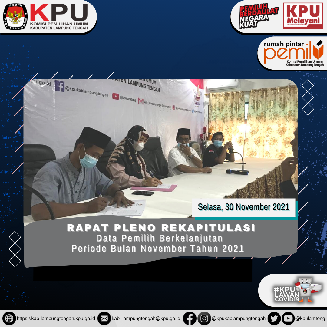KPU Kabupaten Lampung Tengah melaksanakan Rapat Pleno Pemutakhiran Data Pemilih Berkelanjutan (DPB) Periode Bulan November Tahun 2021 di Aula Kantor KPU Kabupaten Lampung Tengah, Selasa (30/11).