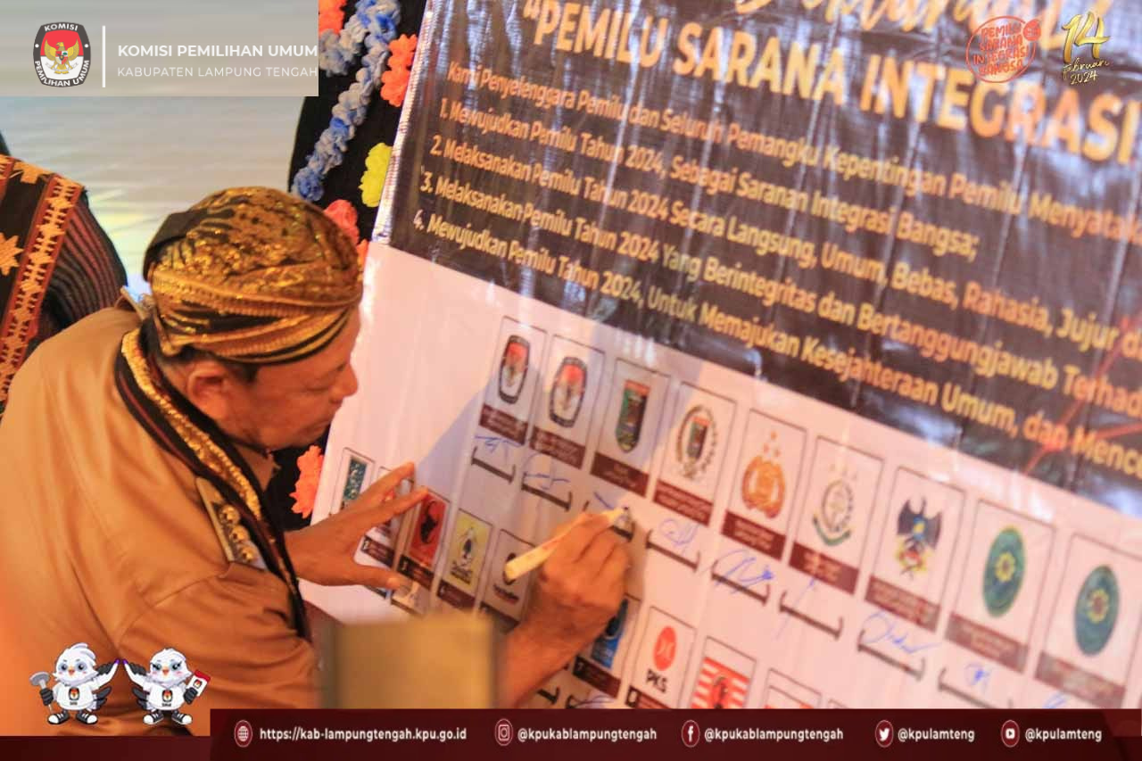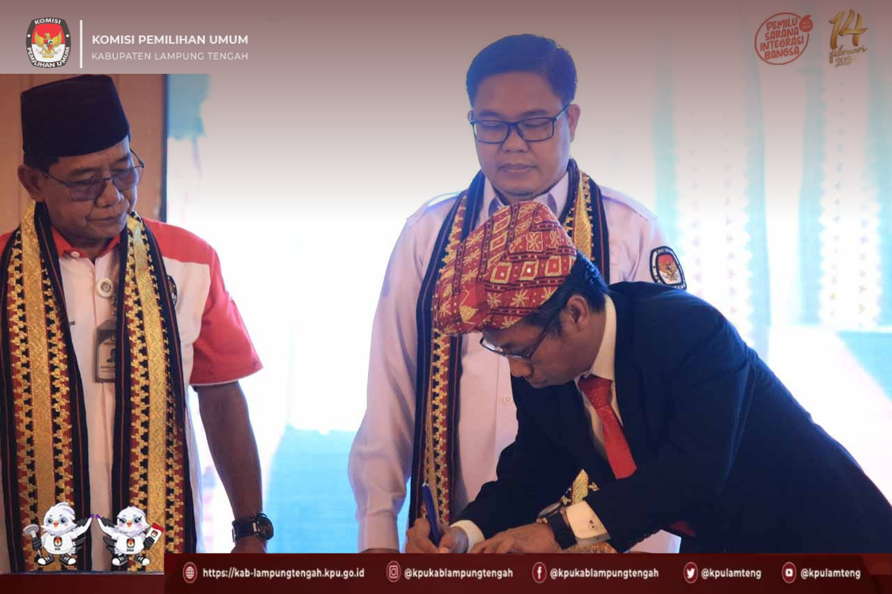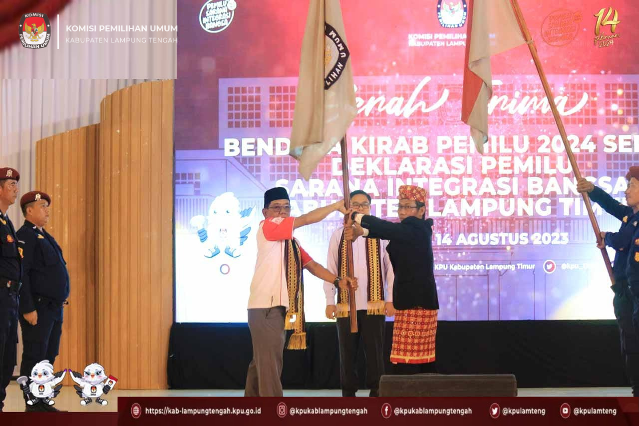 #TemanPemilih, Komisi Pemilihan Umum Kabupaten Lampung Tengah menyerahkan Bendera Kirab Pemilu Tahun 2024 ke KPU Kabupaten Lampung Timur yang dilaksanakan di Gedung Pusiban Pemda Lampung Timur, Senin, (14/08).