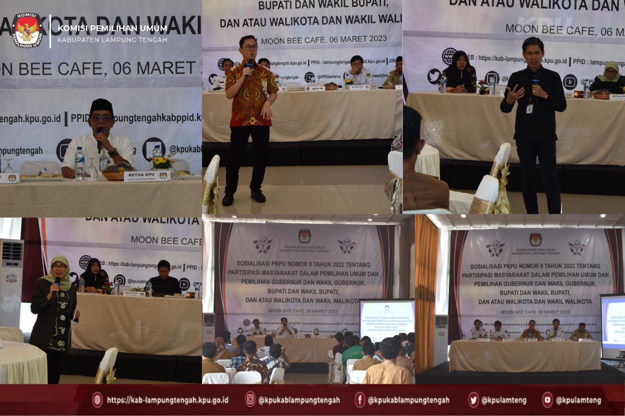 Hadir sebagai peserta sosialisasi, Forkopimda, Organisasi Masyarakat, Tokoh Masyarakat, Partai Politik, PPK dan Sekretariat PPK se-Kabupaten Lampung Tengah, Kegiatan dibuka secara resmi oleh Ketua Komisi Pemilihan Umum Kabupaten Lampung Tengah Irawan Indra Jaya. Bertindak sebagai Moderator Anggota Komisi Pemilihan Umum Kabupaten Lampung Tengah M. Fajrien Mega Putra dan Siti Marfuah Darojati.