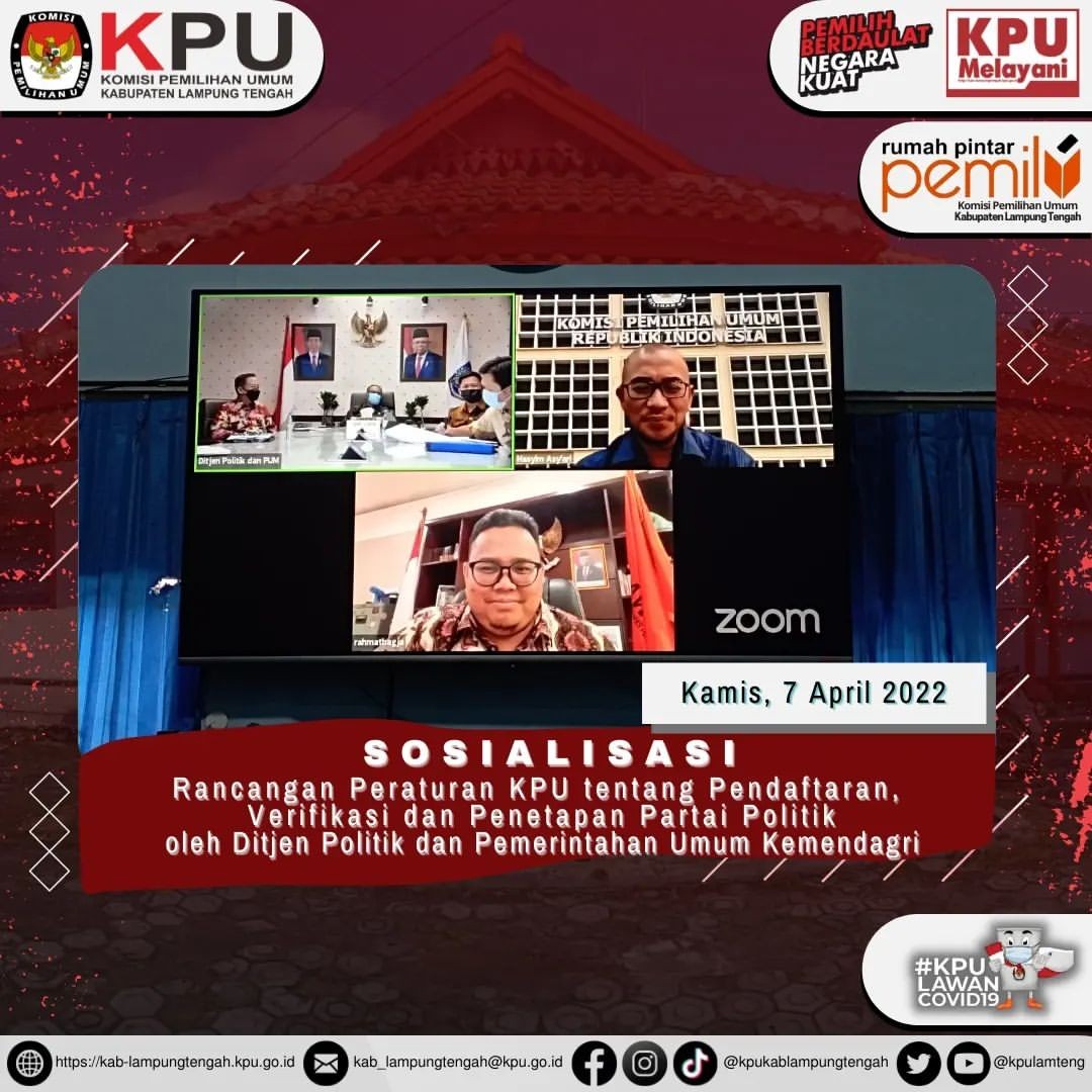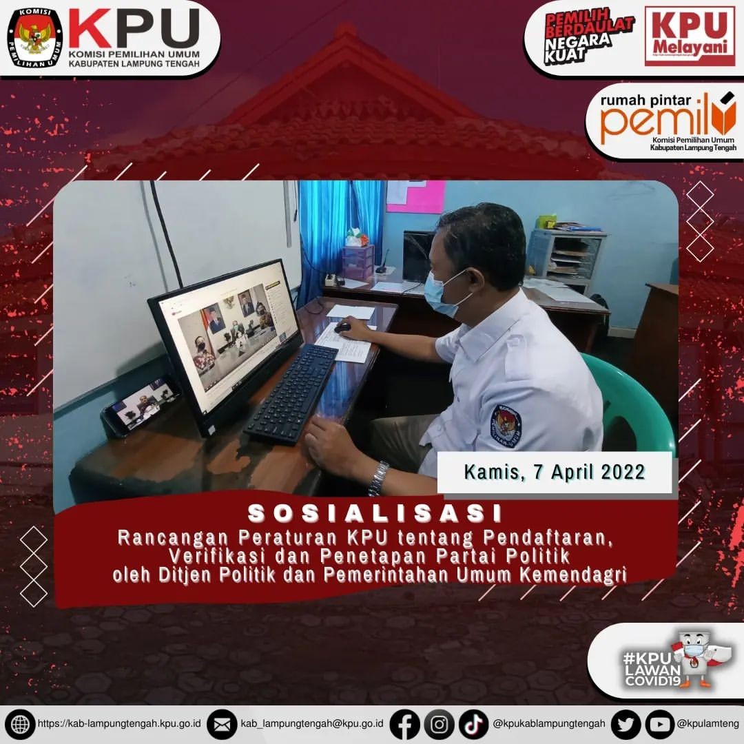 KPU Kabupaten Lampung Tengah mengikuti Sosialisasi Rancangan Peraturan KPU tentang Pendaftaran, Verifikasi dan Penetapan Partai Politik Peserta Pemilu yang diselenggarakan oleh Ditjen Politik dan Pemerintahan Umum Kemendagri, Kamis (07/04).