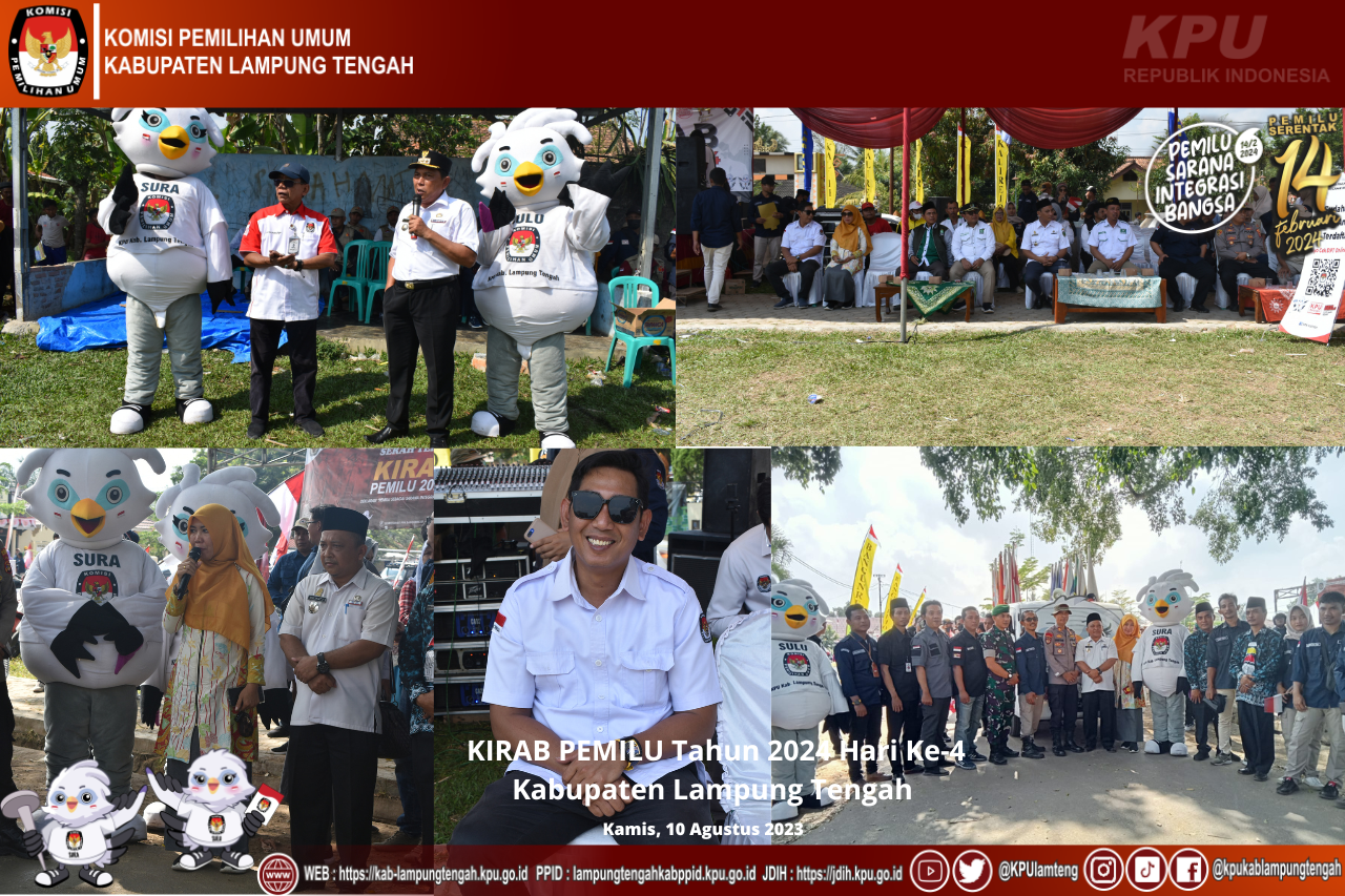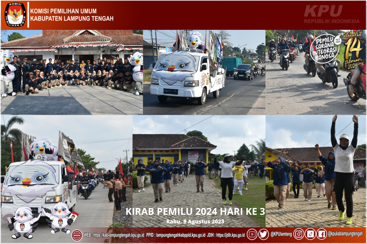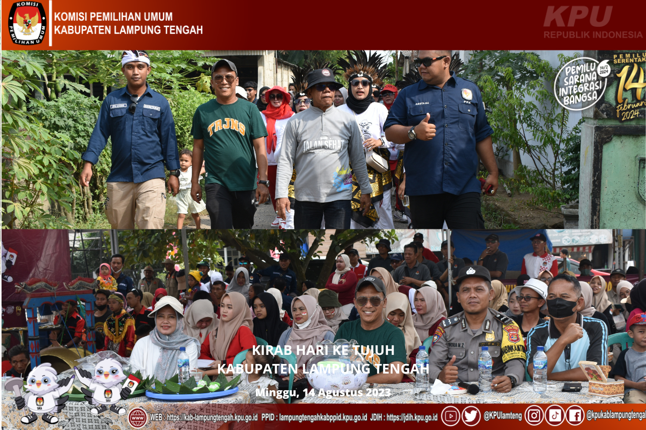 Pada Hari Minggu (13/08/2023) Komisi Pemilihan Umum Kabupaten Lampung Tengah melaksanakan kegiatan Kirab Pemilu Tahun 2024 hari terakhir yang bertempat di Kecamatan Seputih Mataram Kabupaten Lampung Tengah. Kegiatan dimulai dari kantor KPU Lampung Tengah menuju Pasar Merapi Kecamatan Seputih Mataram untuk melaksankan jalan sehat dan Senam Demokrasi. Setibanya di lokasi acara dimulai degan senam demokrasi yang diikuti Ketua, Anggota, Sekretariat KPU Kabupaten Lampung Tengah, PPK dan PPS dari Kecamatan Terbanggi Besar, Kecamatan Seputih Mataram. Kemudian dilanjutkan dengan kegiatan Jalan Sehat yang diikuti oleh seluruh rombongan pawai Kirab Pemilu Tahun 2024 dan masyarakat sekitar. Dalam memeriahkan kirab pemilu Tahun 2024, KPU telah menyiapkan hiburan rakyat dan doorprize/hadiah yang menarik untuk peserta jalan sehat yang kuponnya dibagikan pada saat jalan sehat dilakukan. Disela-sela hiburan rakyat tim rombongan pawai kirab pemilu tahun 2024 juga melaksanakan Grebek Pasar di Pasar Merapi Kecamatan Seputih Mataram. Grebek Pasar ini dilakukan untuk memberikan informasi tentang pelaksanaan Pemilu Tahun 2024.Setelah seluruh rangkain kegiatan telah diselesaikan, rombongan Kirab Pemilu 2024 kembali ke kantor KPU Kabupaten Lampung Tengah.