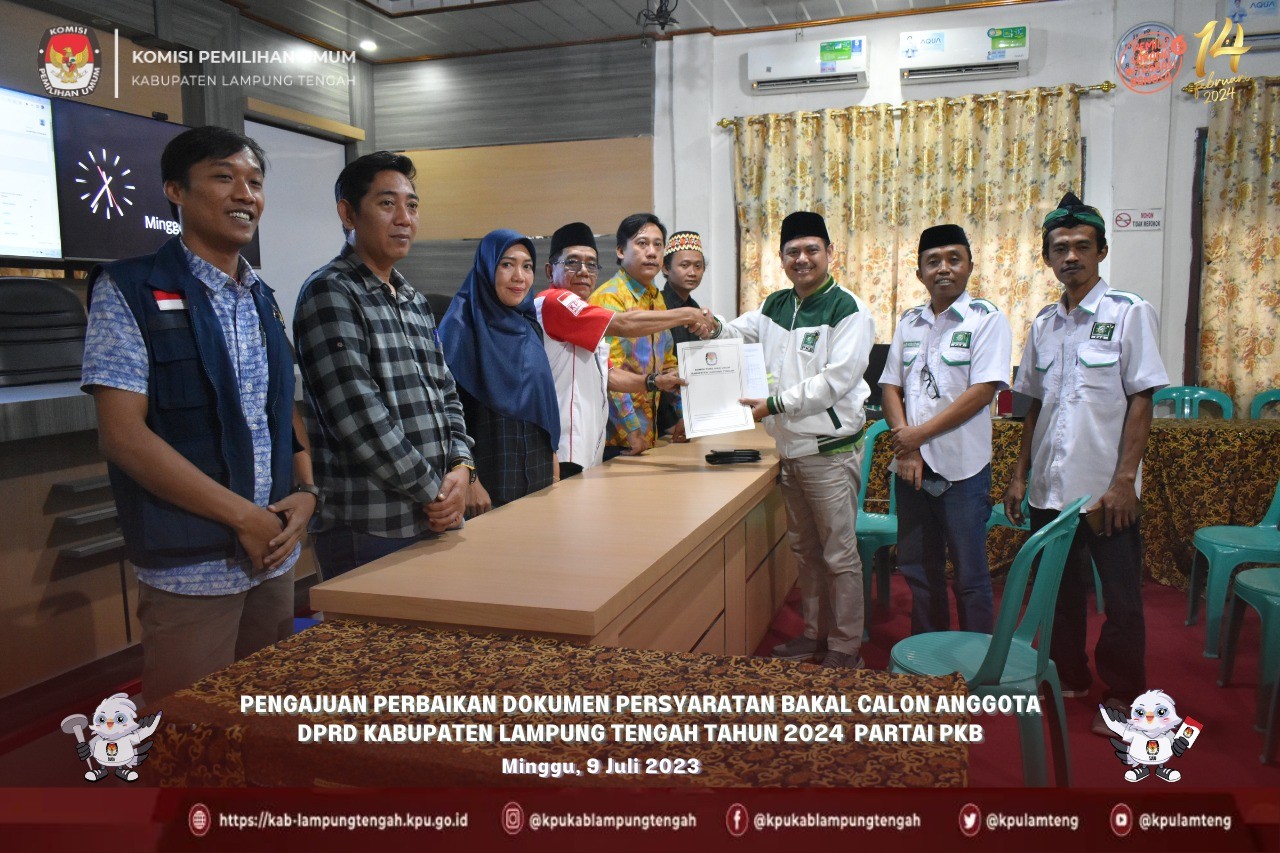 #TemanPemilih, Partai Gerindra mengajukan Dokumen Perbaikan Bakal Calon Anggota DPRD Pemilu 2024. Penyerahan Dokumen Perbaikan berlangsung di aula kantor Komisi Pemilihan Umum Kabupaten Lampung Tengah, Minggu (9/7/2023). Proses penyerahan Dokumen Perbaikan tersebut diterima langsung oleh Ketua Komisi Pemilihan Umum Kabupaten Lampung Tengah, Irawan Indra Jaya dan disaksikan Anggota Badan Pengawas Pemilihan Umum (Bawaslu) Kabupaten Lampung Tengah. Dokumen Perbaikan yang telah diterima selanjutnya dilakukan verifikasi oleh tim verifikator untuk dilihat kelengkapan dan kebenaran berkasnya. Pada Peraturan KPU Nomor 10 Tahun 2023 Tentang Pencalonan Anggota Dewan Perwakilan Rakyat, Dewan Perwakilan Raky Daerah Provinsi, Dan Dewan Perwakilan Rakyat Daerah Kabupaten/Kota, dan sesuai dengan hasil verifikasi administrasi yang telah dilaksanakan oleh Komisi Pemilihan Umum Kabupaten Lampung Tengah, Partai Politik diberikan kesempatan untuk melakukan perbaikan dokumen persyaratan Bakal Calon sejak tanggal 26 Juni hingga 9 Juli 2023. Pada tanggal 9 juli 2023 pendaftaran akan dibuka sejak pukul 08.00 s/d 23.59 WIB. Partai Politik Peserta Pemilu pada kepengurusan tingkat pusat, provinsi, dan kabupaten/kota mengajukan perbaikan dokumen persyaratan Bakal Calon pada masa perbaikan setelah mengirimkan data dan dokumen perbaikan persyaratan Bakal Calon kepada KPU, KPU Provinsi, dan KPU Kabupaten/Kota melalui Silon. #KPUMelayani #KPULamTeng #PemiluSerentak2024