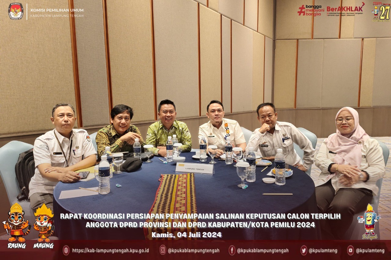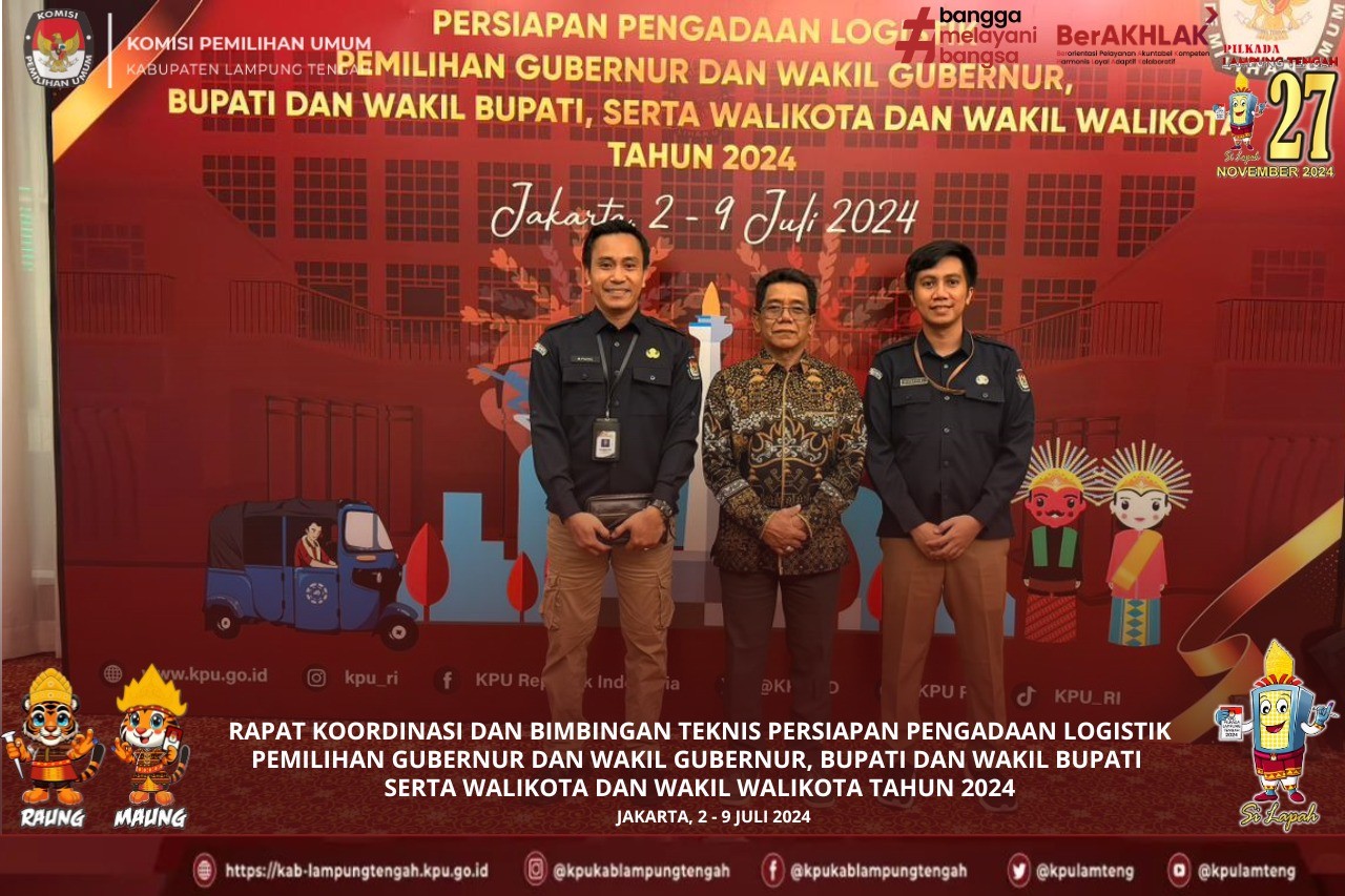 #TemanPemilih, Ketua KPU Kabupaten Lampung Tengah, Irawan Indra Jaya dan Sekretaris KPU Kabupaten Lampung Tengah, Muhammad Faizal mengikuti Rapat Koordinasi Dan Bimbingan Teknis Persiapan Pengadaan Logistik Pemilihan Gubernur Dan Wakil Gubernur, Bupati Dan Wakil Bupati Serta Walikota Dan Wakil Walikota Tahun 2024 di Jakarta, Selasa (2/7/2024).