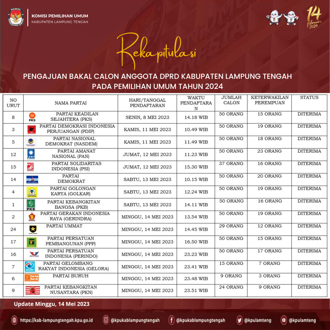 Berdasarkan Dokumen Pengajuan serta Daftar Bakal Calon yang sudah mendapat persetujuan dari DPP Golkar, baik dokumen fisik dan digital yang diunggah di SILON telah memenuhi indikator kelengkapan dan kebenaran serta memenuhi syarat, serta indikator kelengkapan berkas administrasi bakal calon sudah seluruhnya diunggah di SILON sehingga pengajuan Bakal Calon Anggota DPRD Kabupaten Lampung Tengah dari Partai Golkar Kabupaten Lampung Tengah dinyatakan diterima.