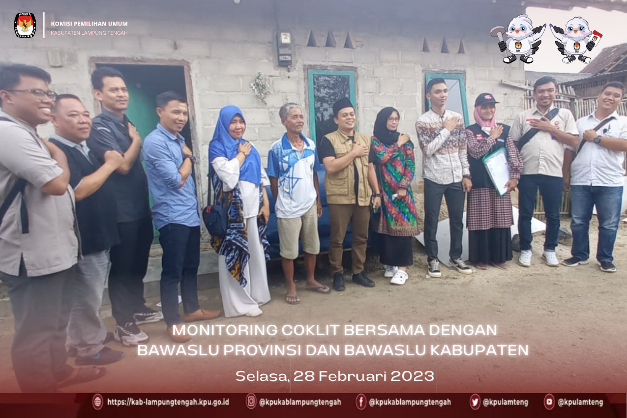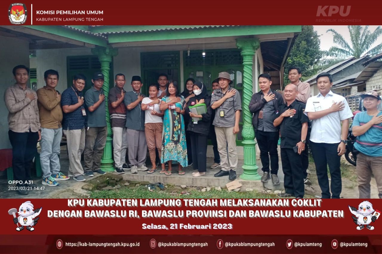 #TemanPemilih, Pada Hari Selasa 21 Februari 2023, Komisi Pemilihan Umum Kabupaten Lampung Tengah melaksanakan Pencocokan dan Penelitian Data Pemilih (Coklit). Komisi Pemilihan Umum (KPU) dan Badan Pengawas Pemilihan Umum (Bawaslu) bekerja sama dalam melakukan kegiatan coklit atau pencocokan dan penelitian data pemilih. Coklit dilakukan untuk memastikan bahwa data pemilih yang terdaftar di dalam Daftar Pemilih Tetap (DPT) pada Pemilihan Umum nantinya akurat dan valid.